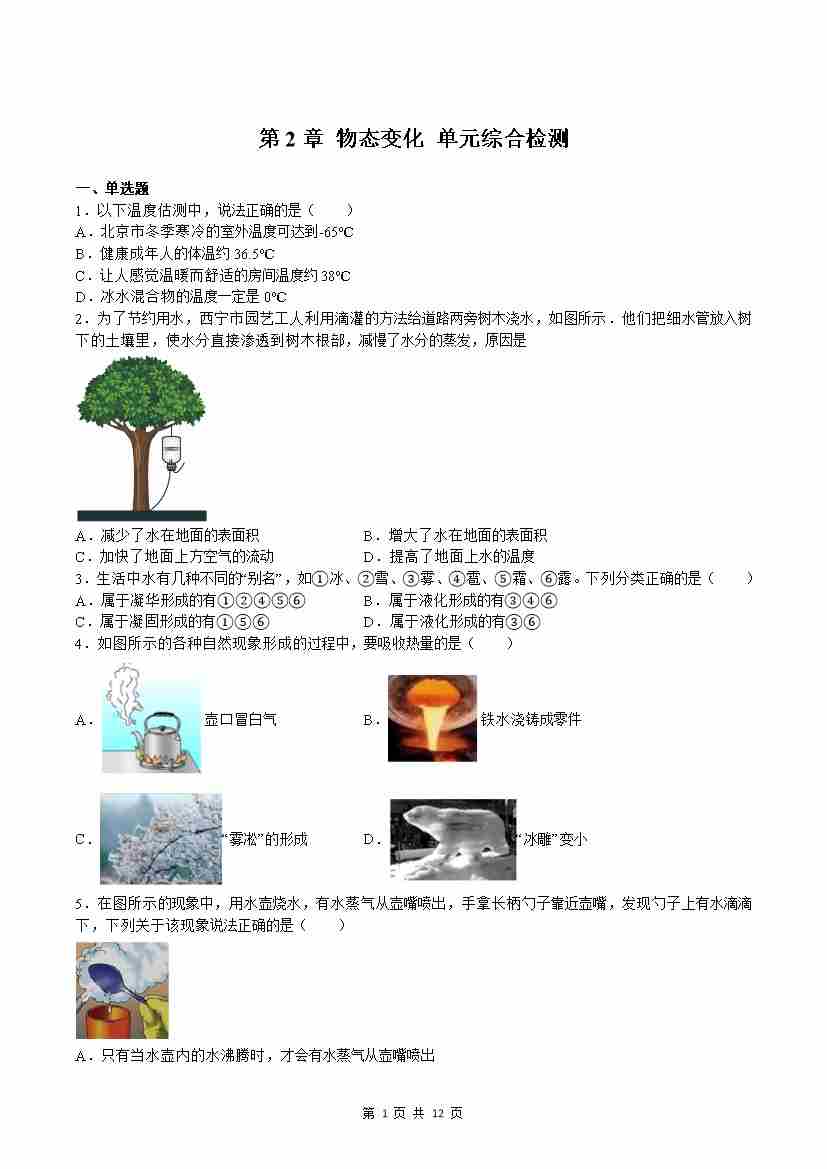 第2章 物态变化 单元综合检测(练习)(原卷版)