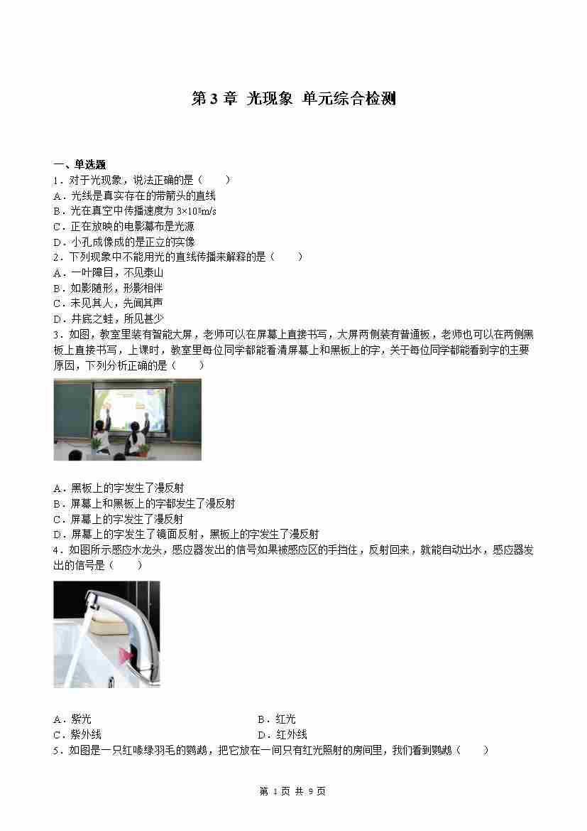 第3章 光现象 单元综合检测(练习)(原卷版)