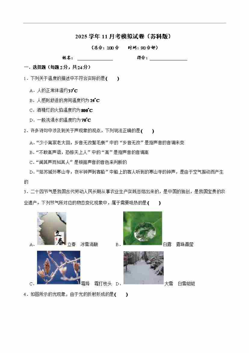 2025学年11月考模拟试卷(苏科版)-原卷版