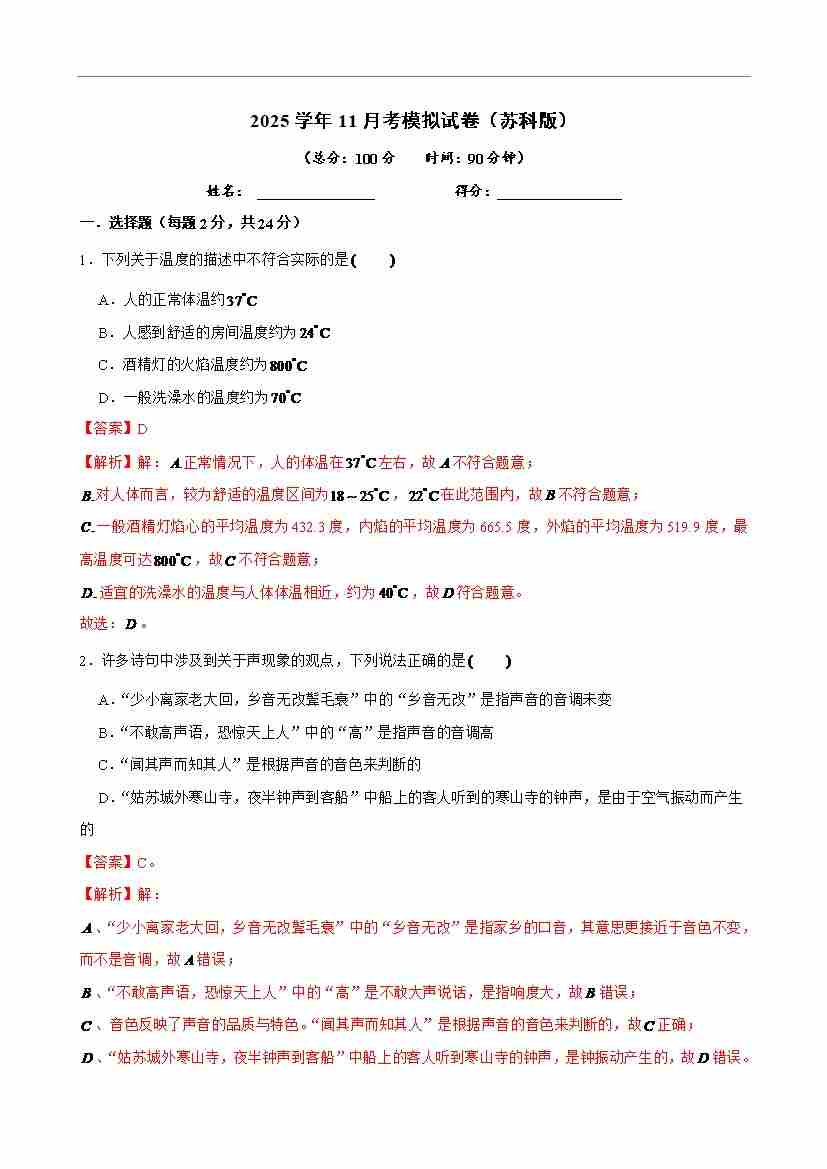 2025学年11月考模拟试卷(苏科版)-解析版