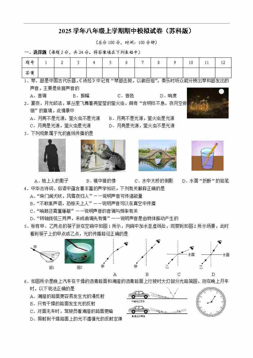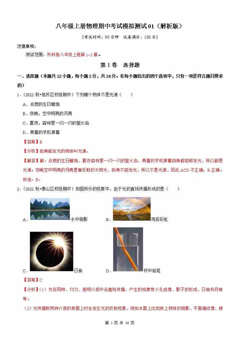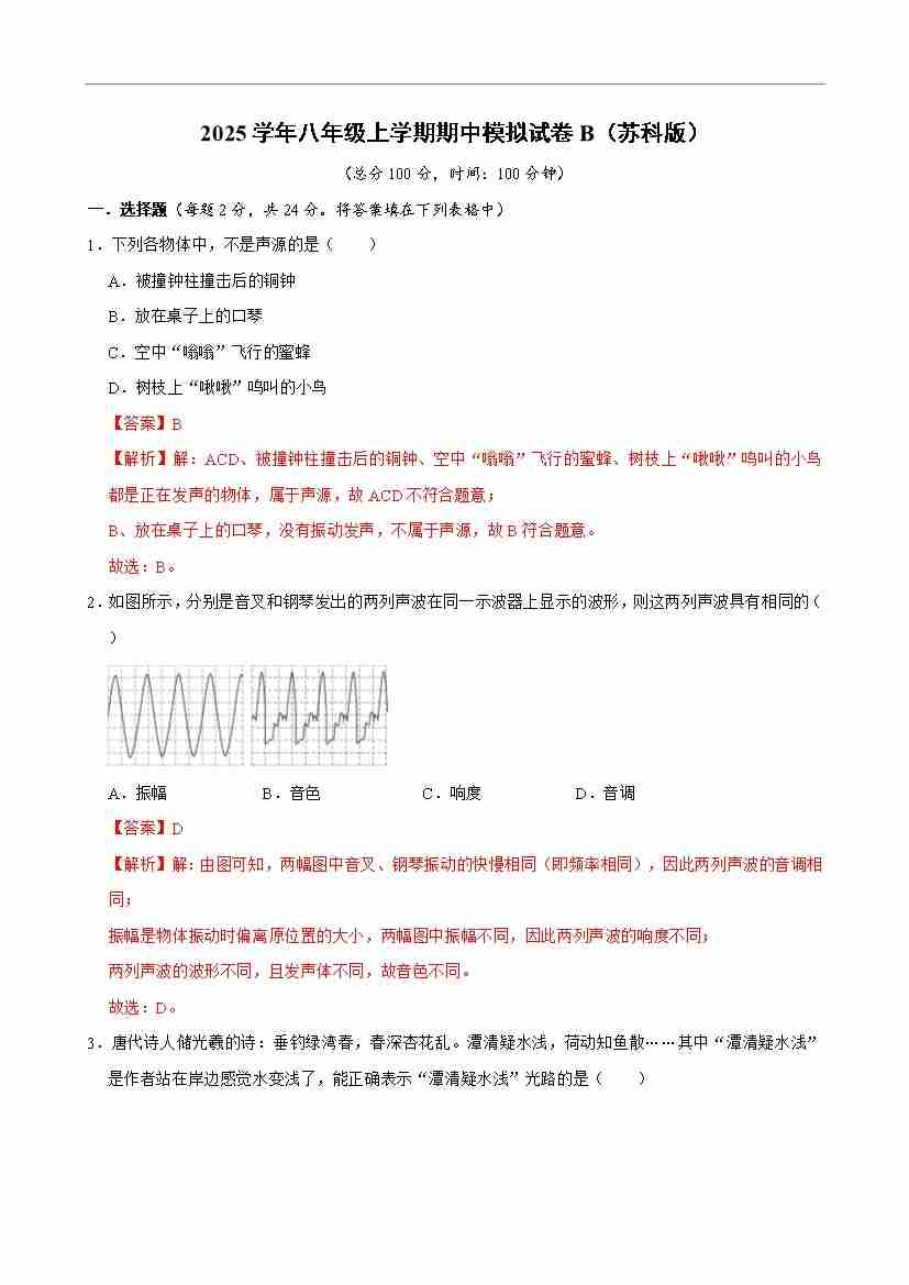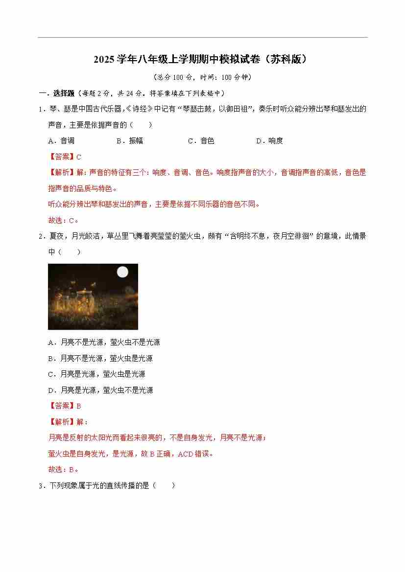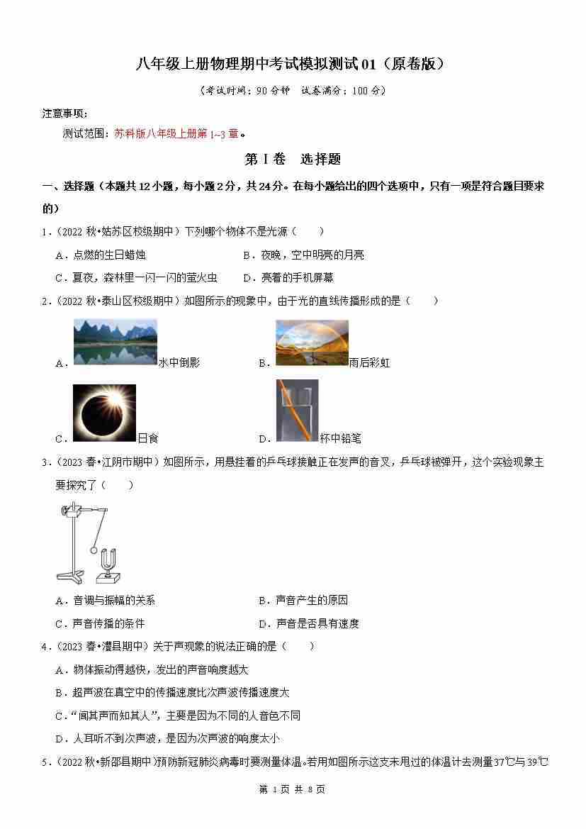 【苏科】8上物理期中卷【1-3章】