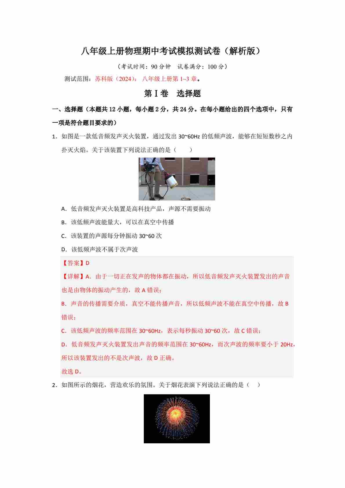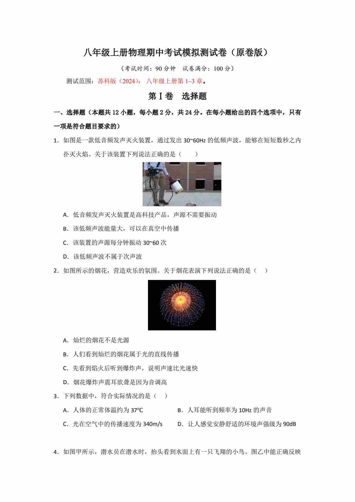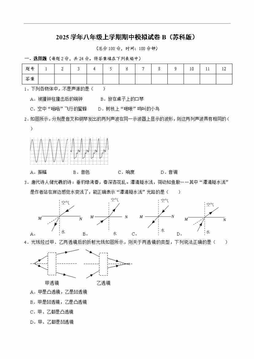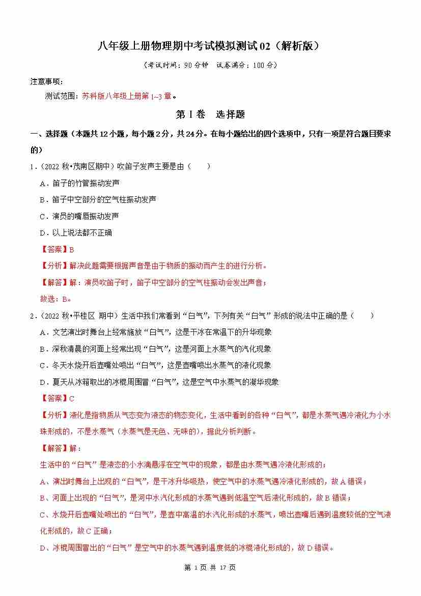 【苏科】8上物理期中卷【1-3章】