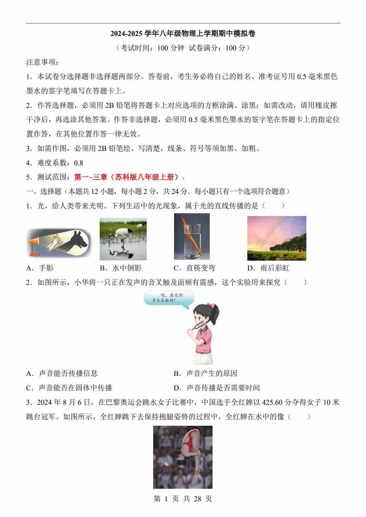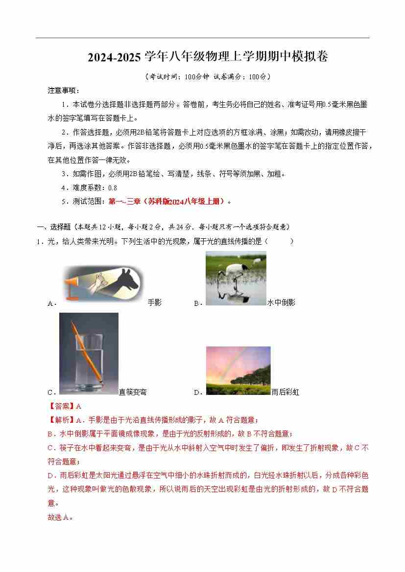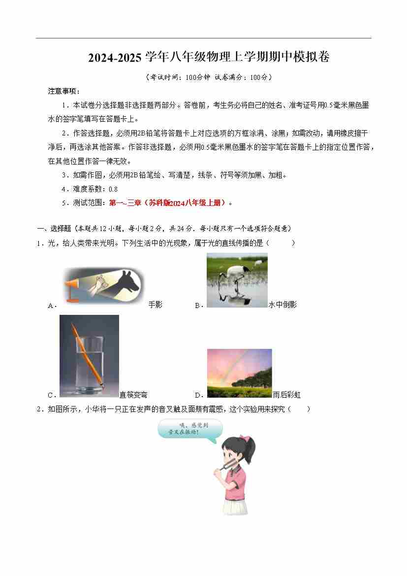 八年级物理期中模拟卷(考试版A4)【测试范围:苏科版2024第1~3章】