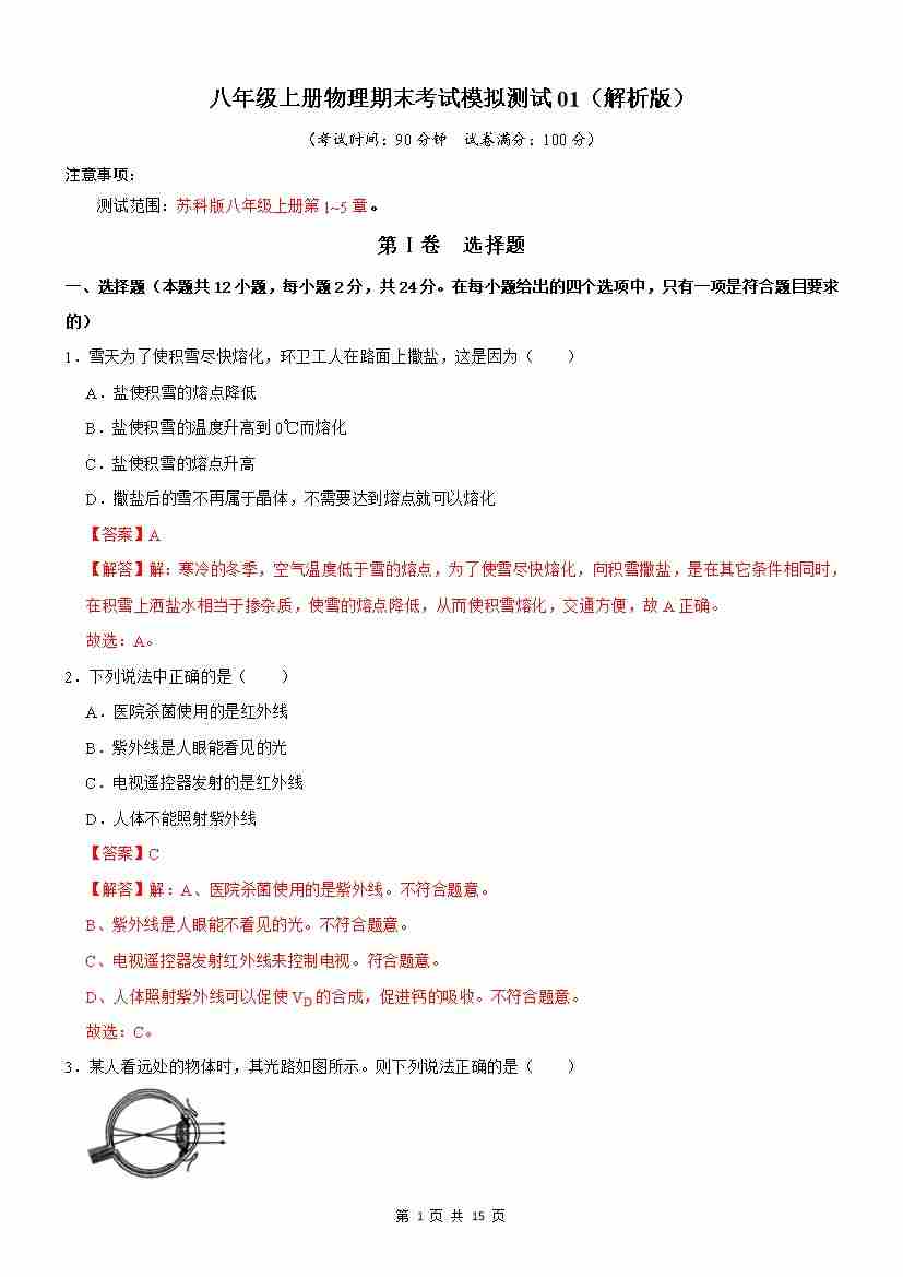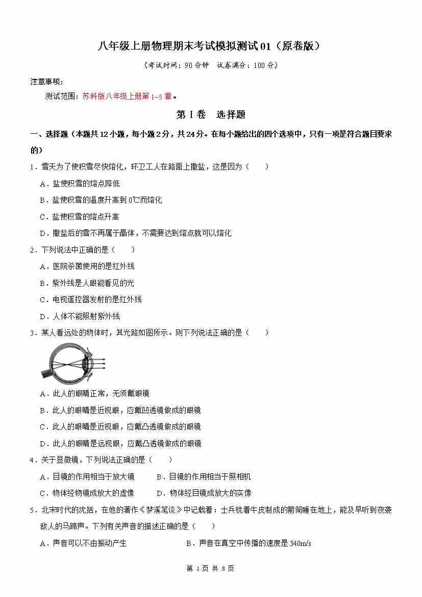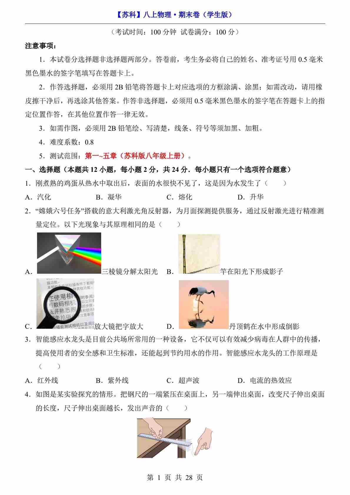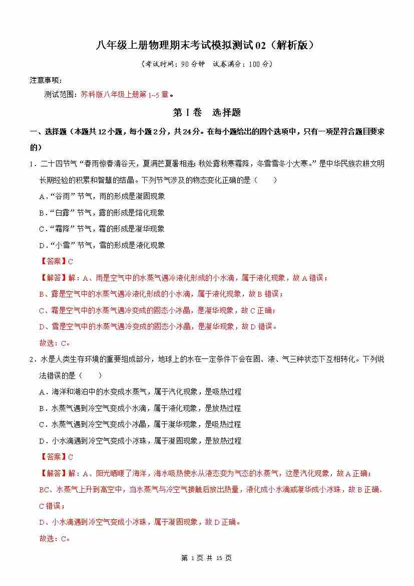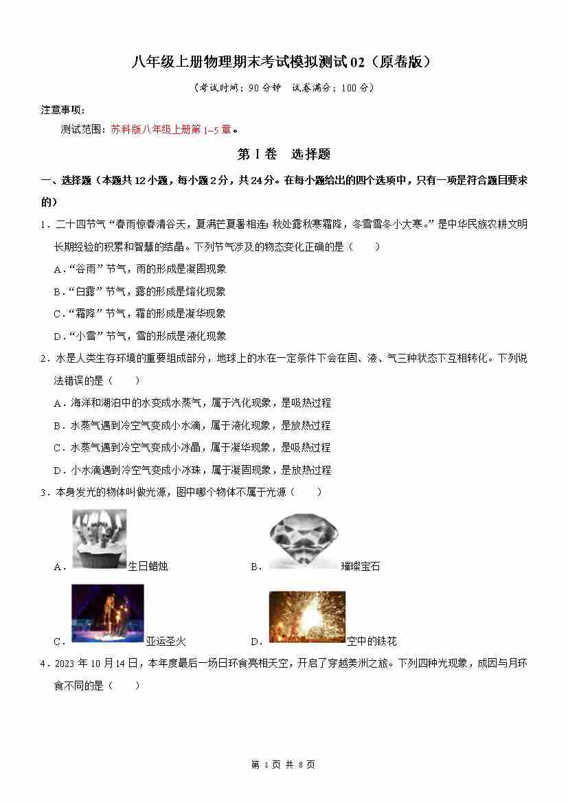 【苏科】8上物理期末卷【8上全册】