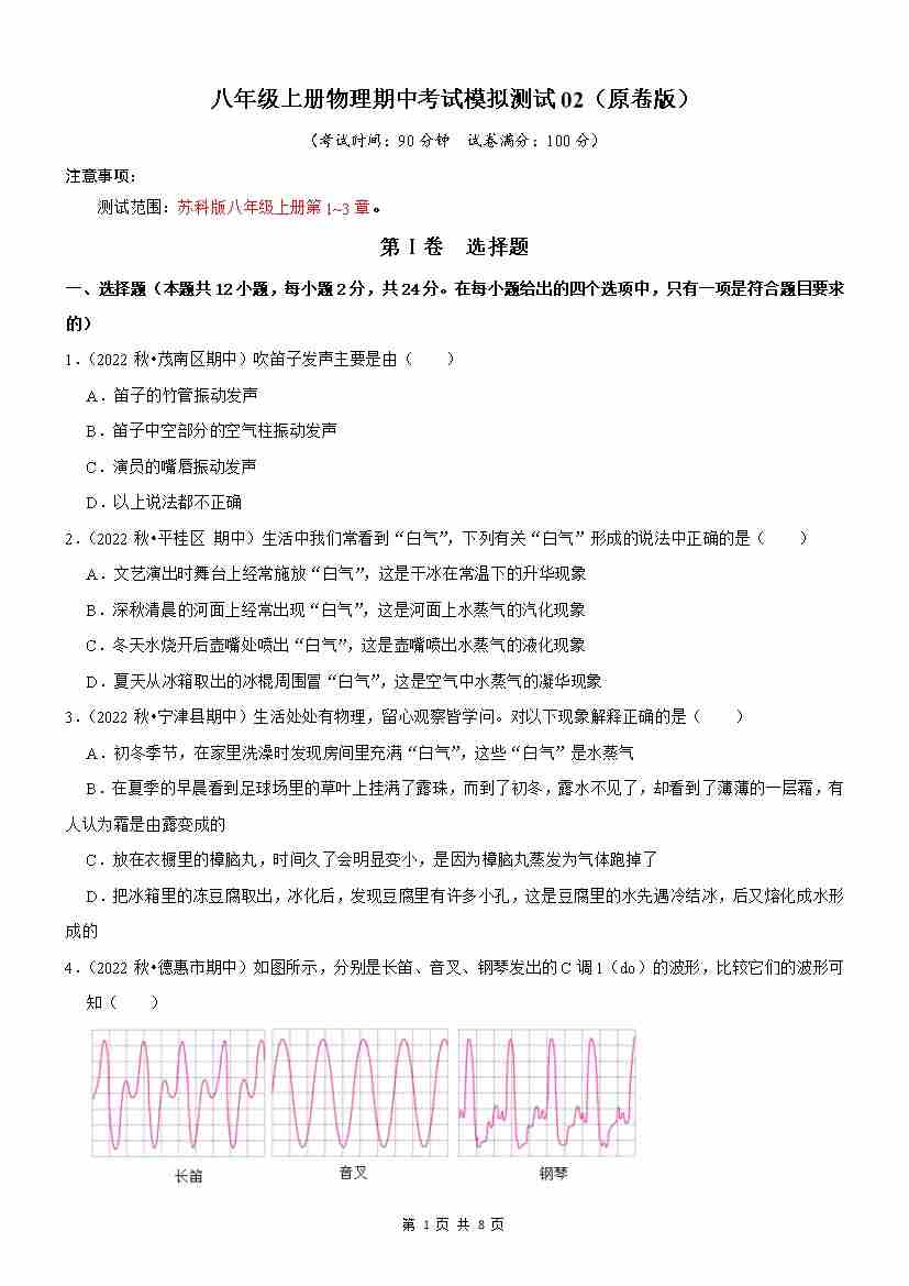 八年级上册物理期中考试模拟测试卷(原卷版)