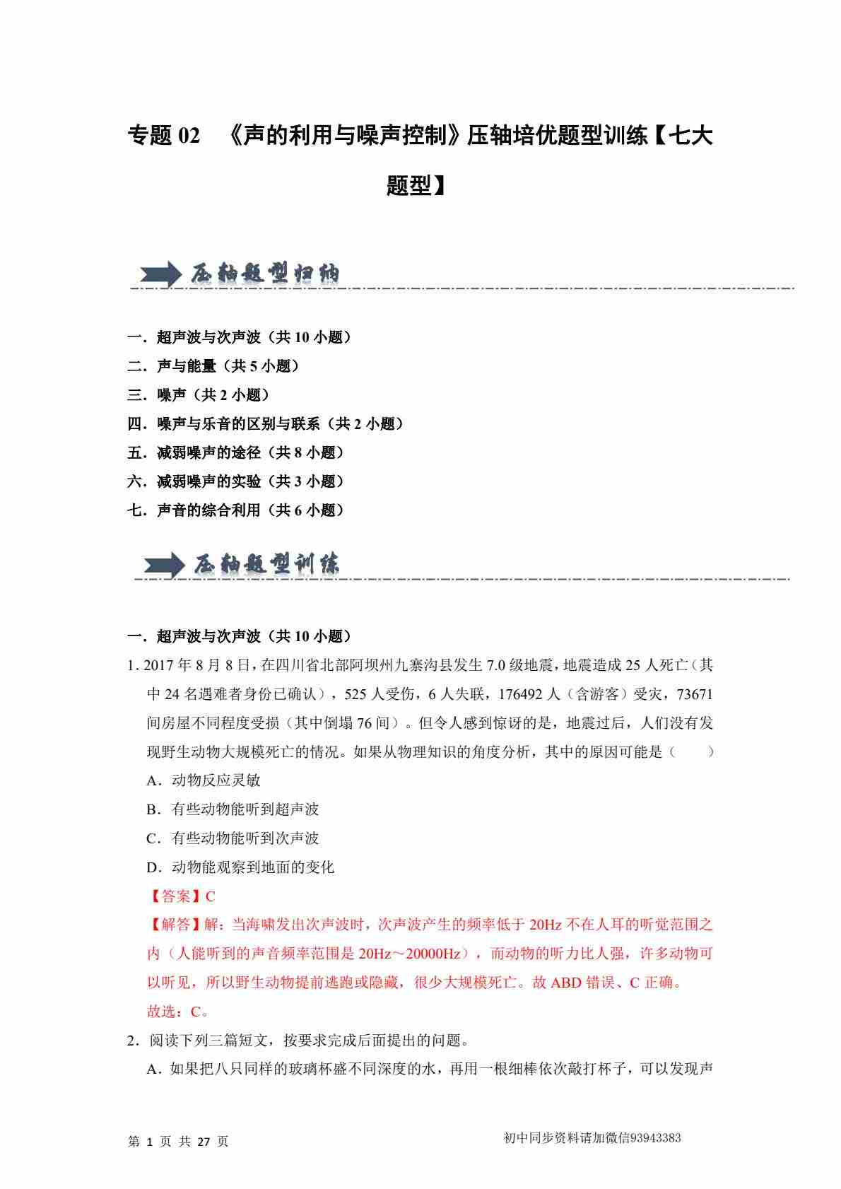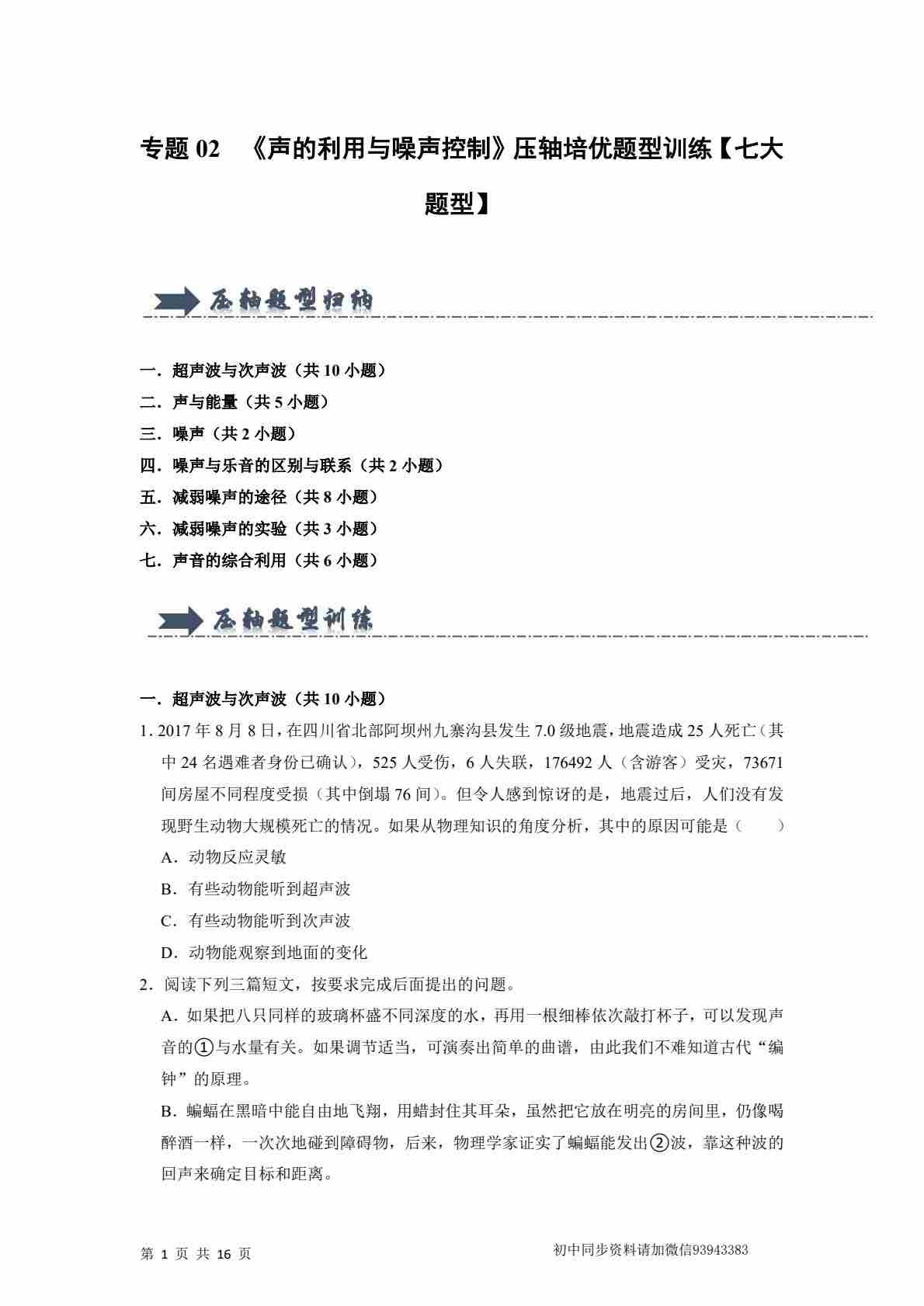 专题02 《声的利用与噪声控制》压轴培优题型训练【七大题型】(原卷版)