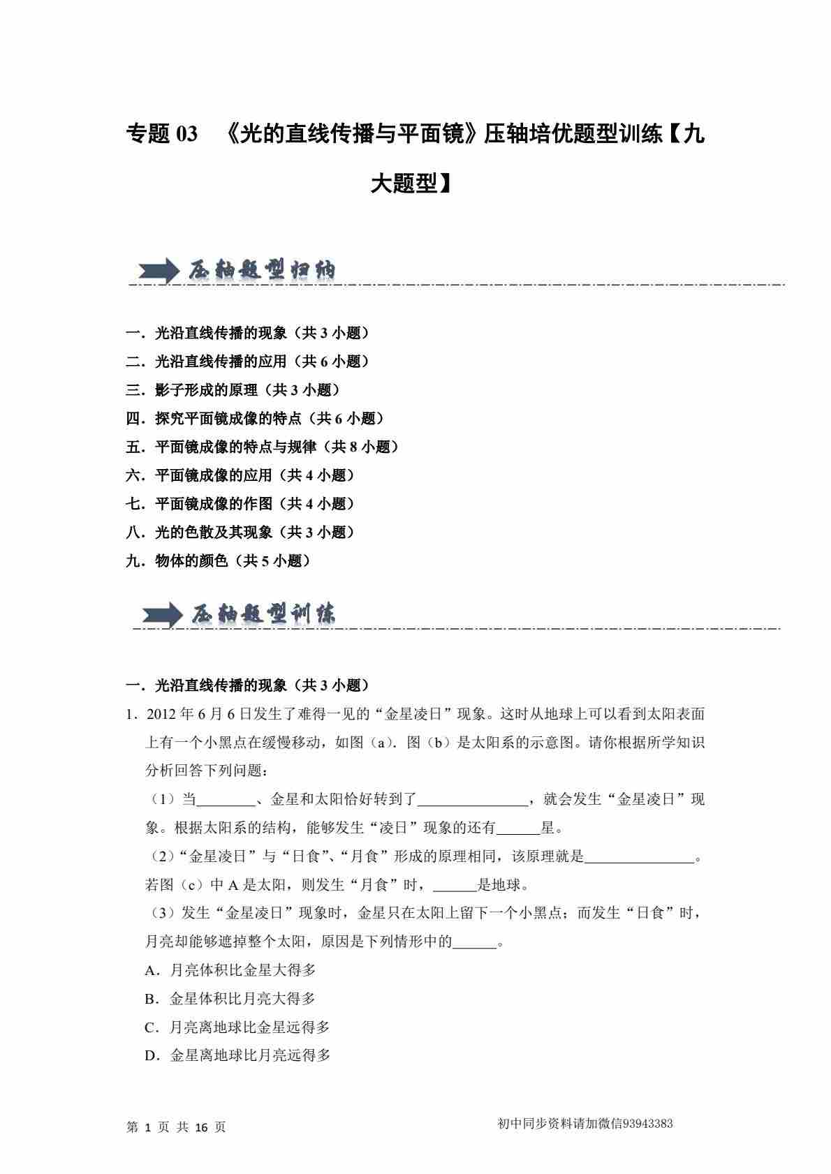 专题03 《光的直线传播与平面镜》压轴培优题型训练【九大题型】(原卷版)