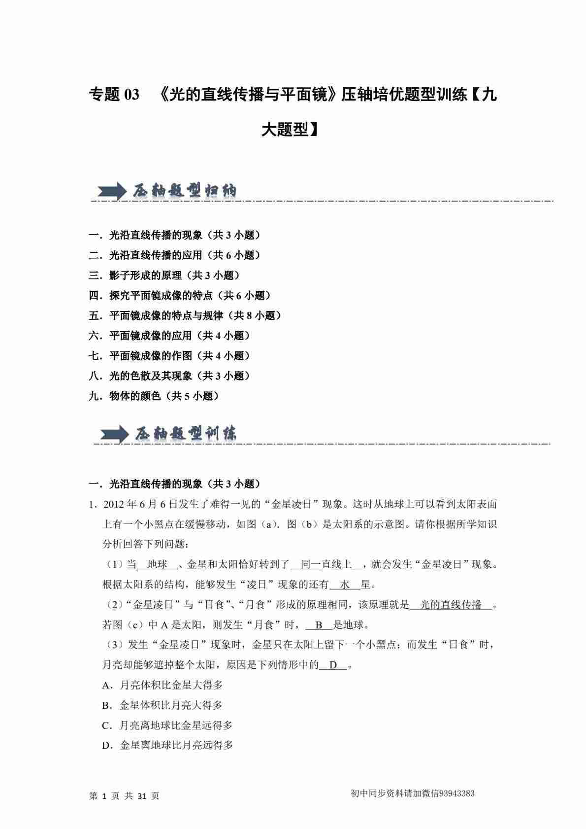 专题03 《光的直线传播与平面镜》压轴培优题型训练【九大题型】(解析版)