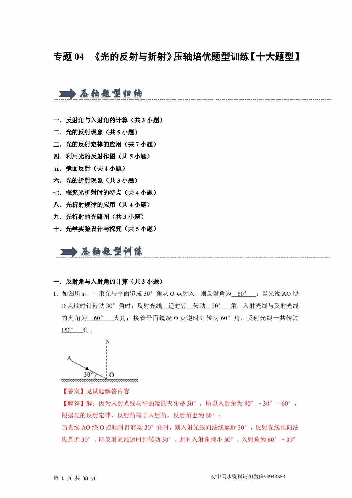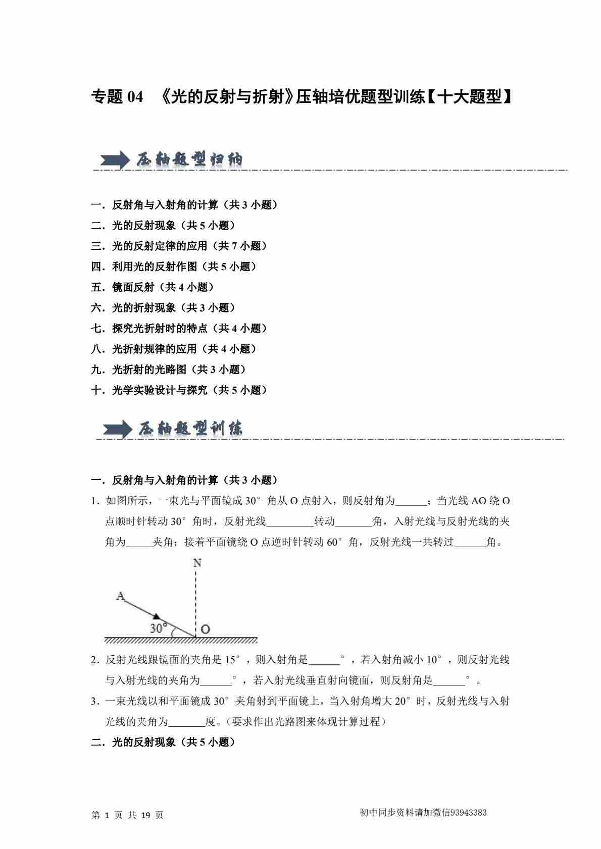专题04 《光的反射与折射》压轴培优题型训练【十大题型】(原卷版)