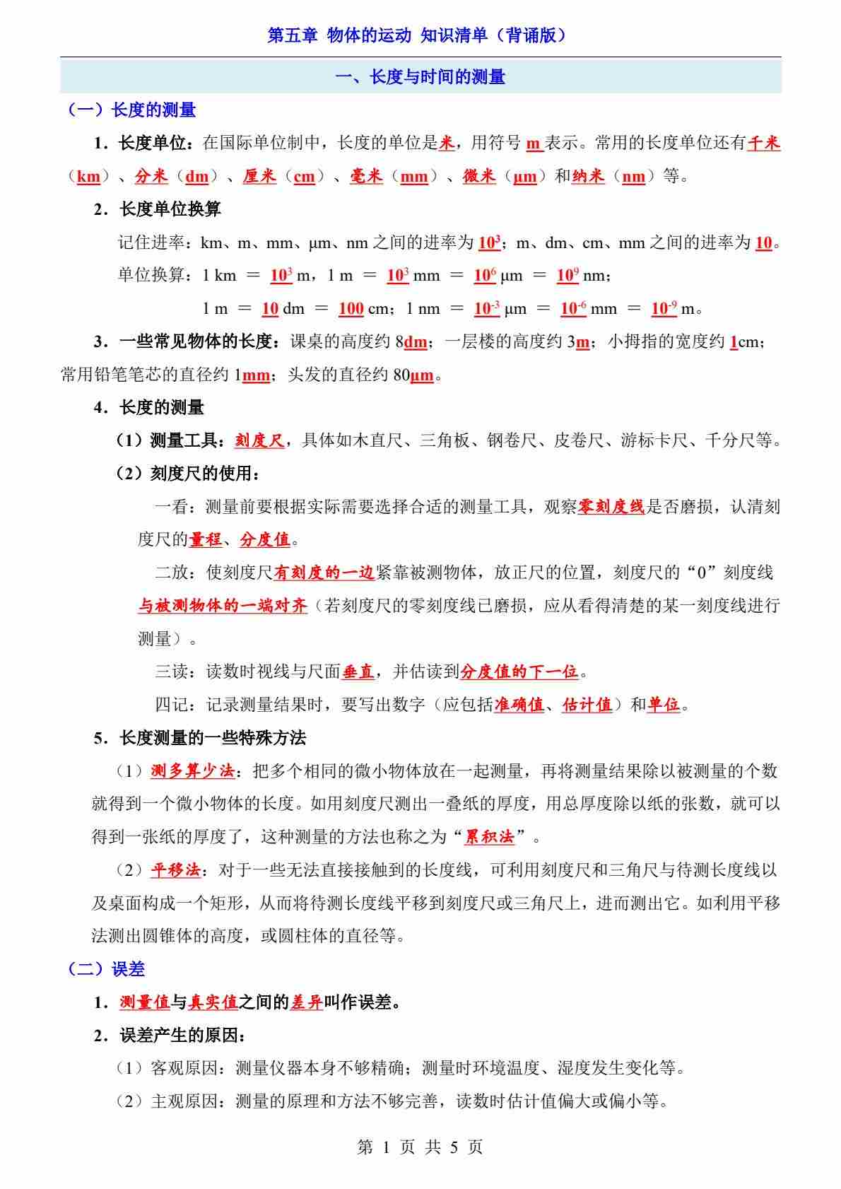 第5章 物体的运动(知识清单-背诵版)