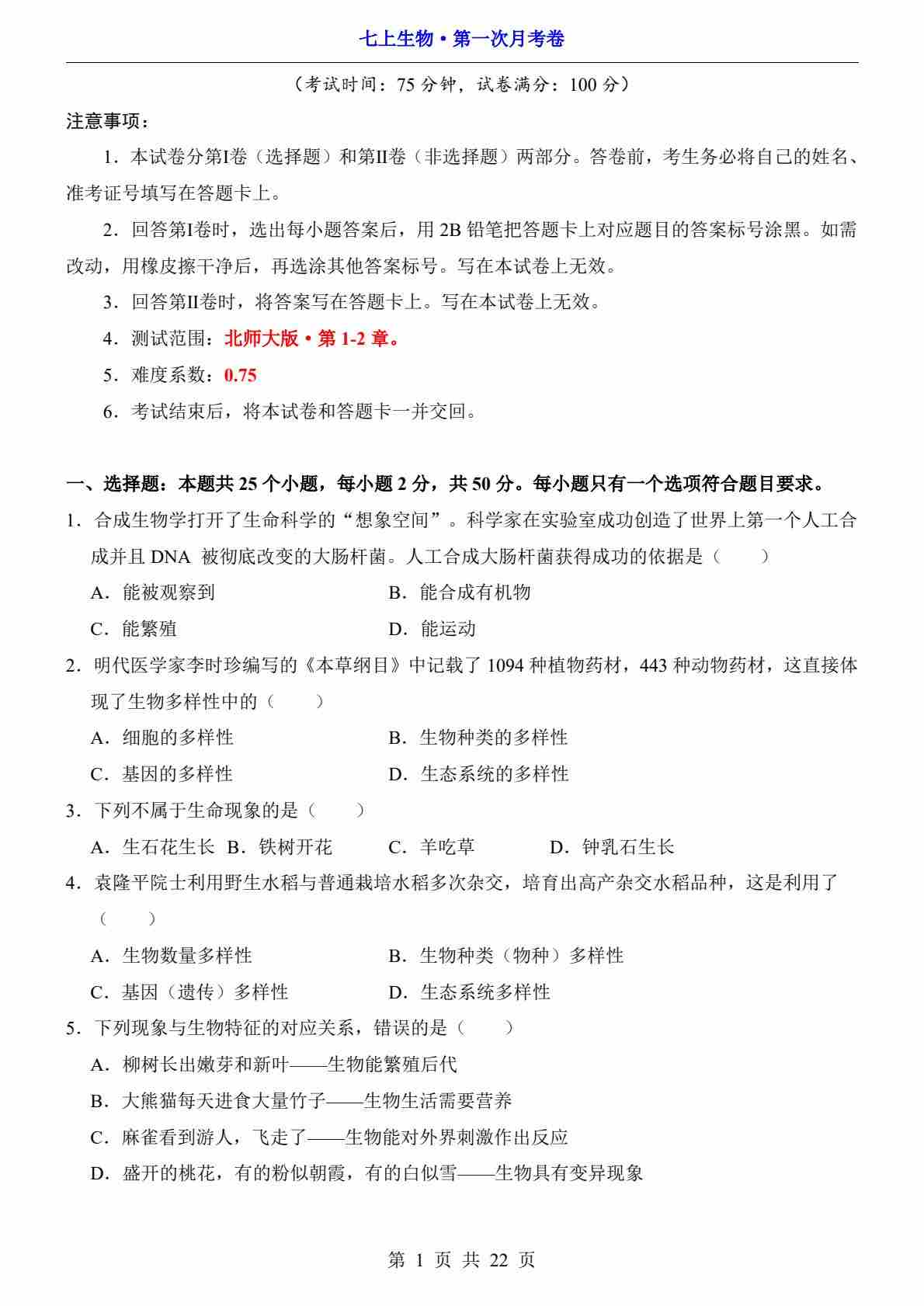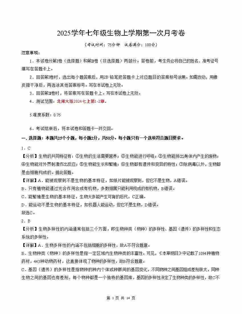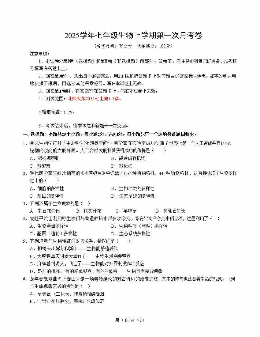 七年级生物第一次月考卷(A4考试版)【测试范围:七上第1-2章】(北师大版2024)