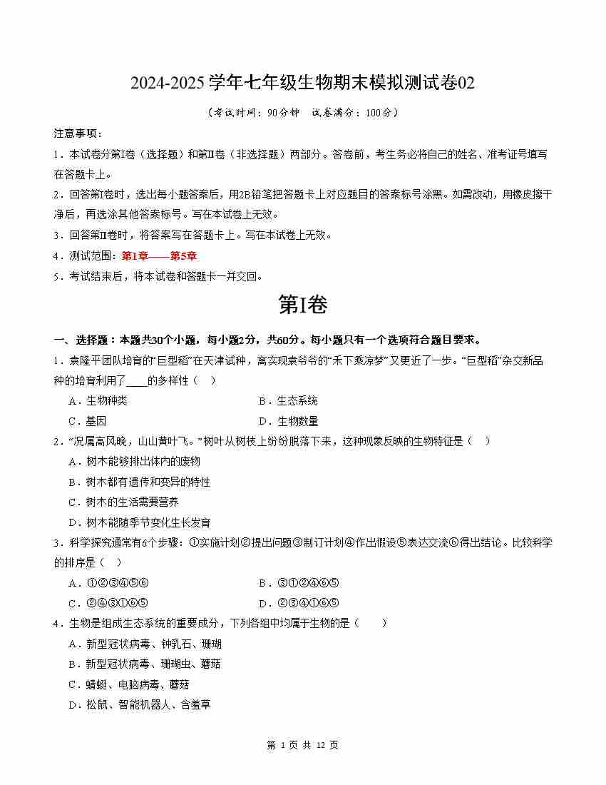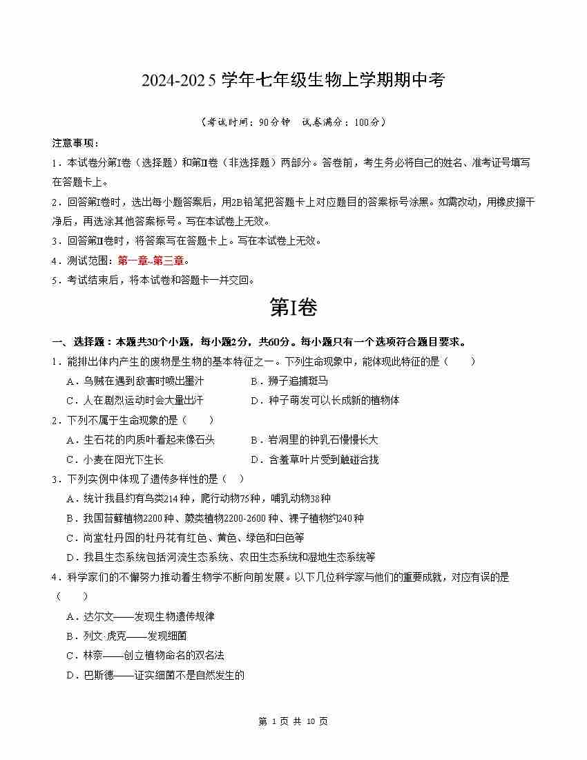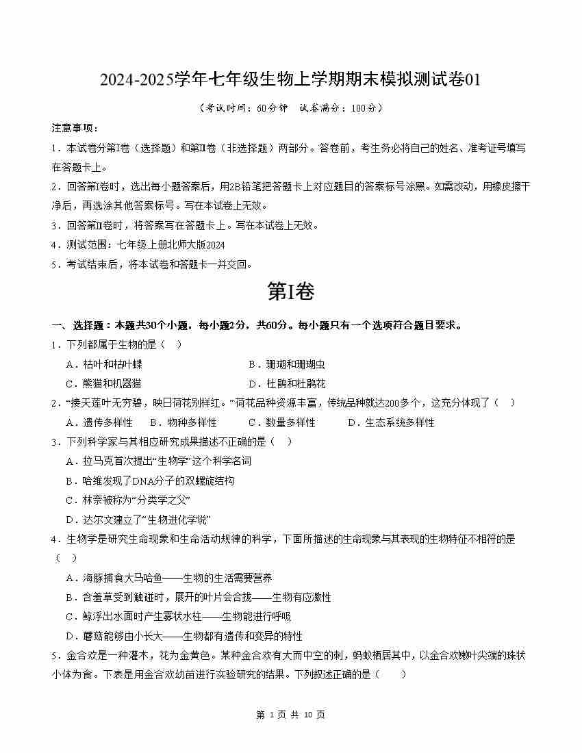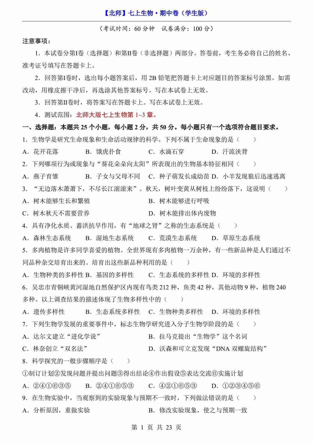 第1章 认识生物和生物学【单元卷·考点卷】(原卷版)-七年级上册生物(新北师大版)