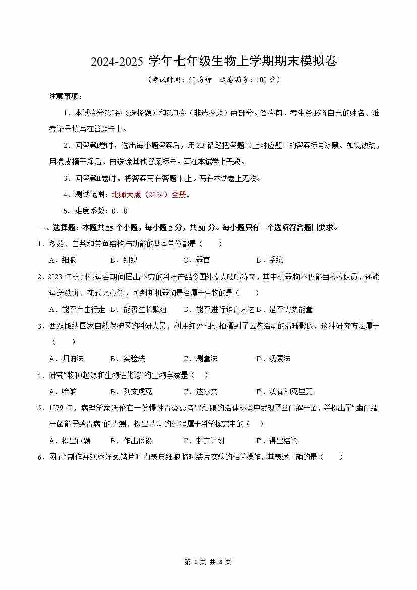 第2章 细胞【单元卷·考点卷】(原卷版)-七年级上册生物(新北师大版)