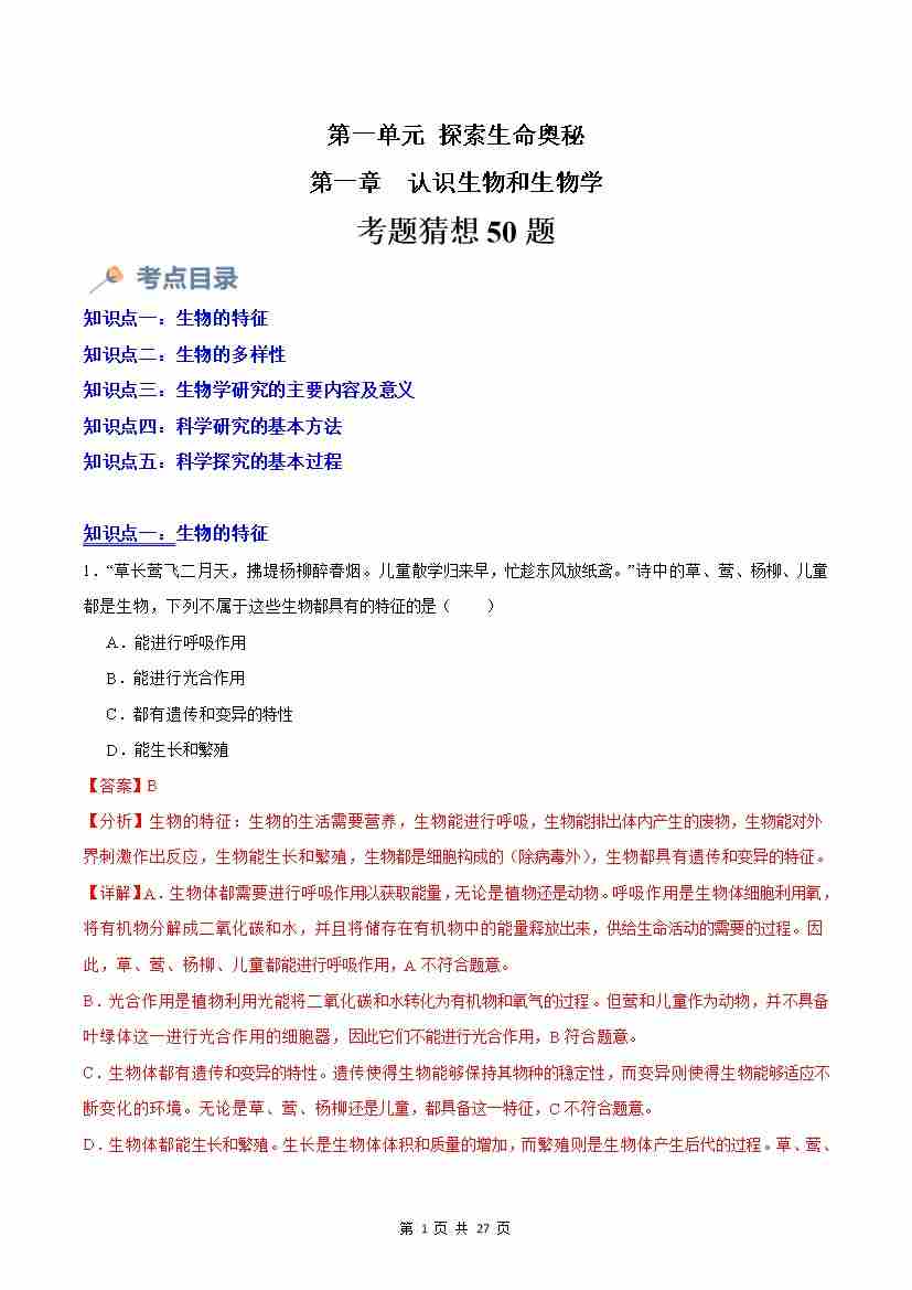 第1章 认识生物和生物学(考题猜想50题)(解析版)