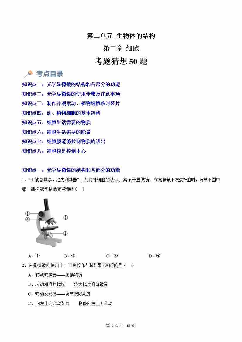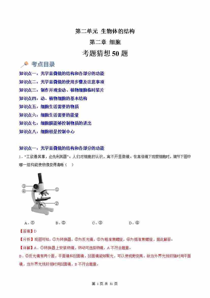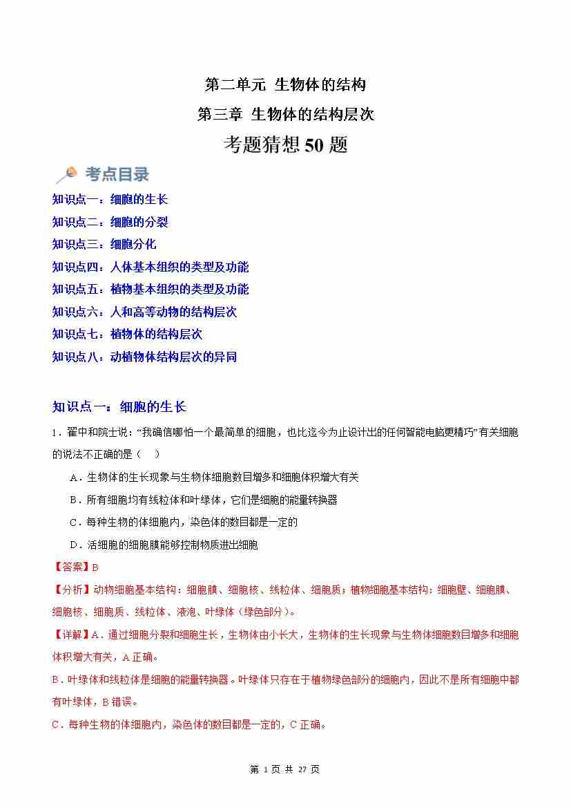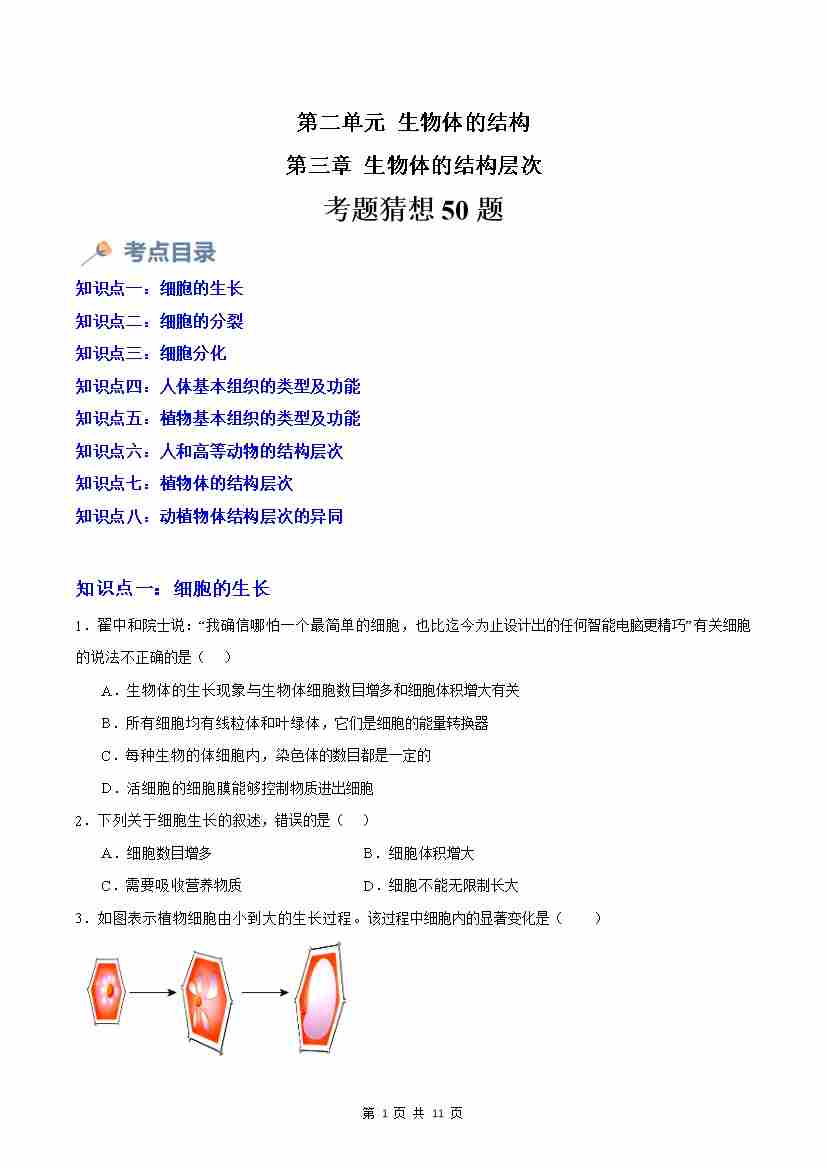 第3章 生物体的结构层次(考题猜想50题)(原卷版)docx