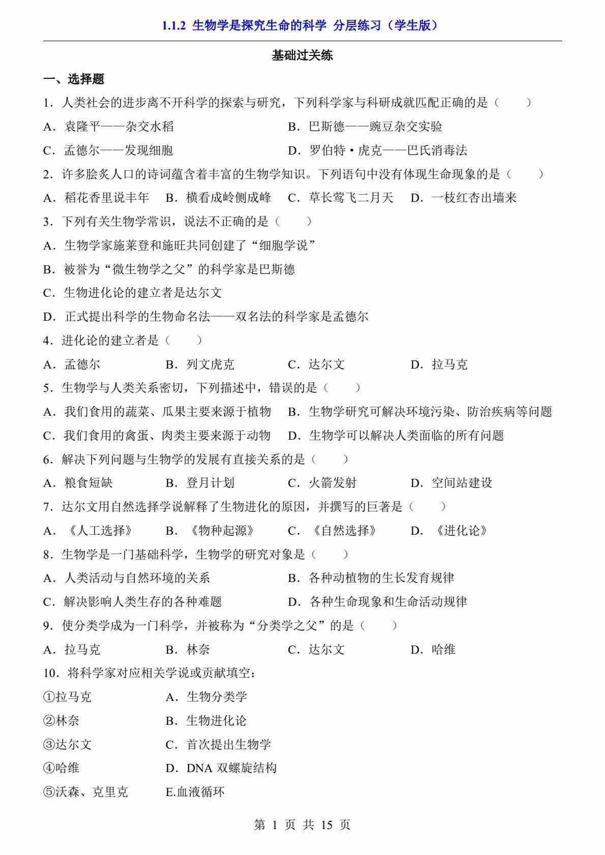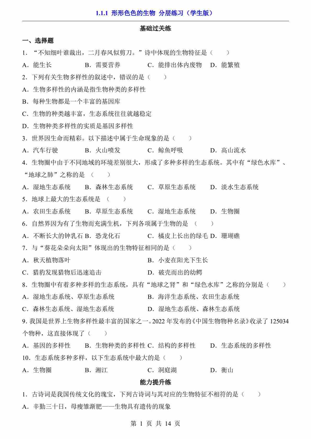 1.1.1 形形色色的生物(分层练习)