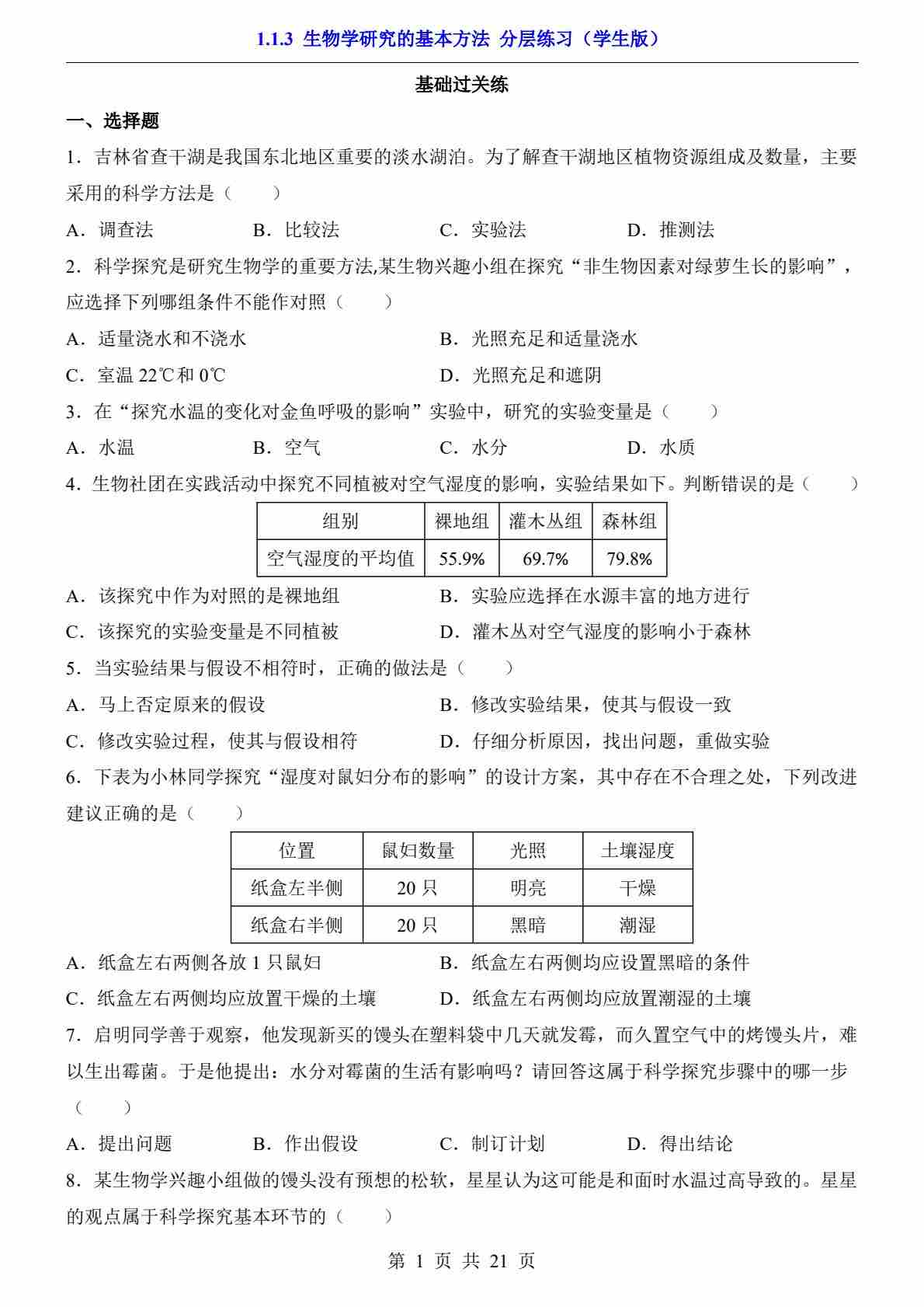 1.1.3 生物学研究的基本方法(分层练习)