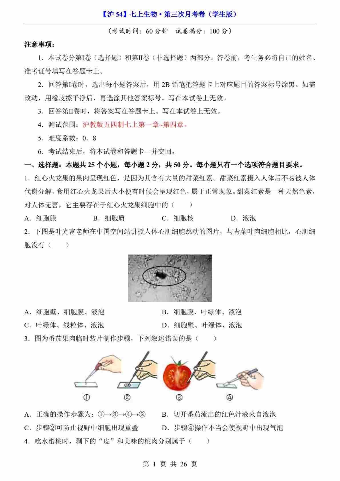【沪教54】7上生物第3次月考【第1-4章】