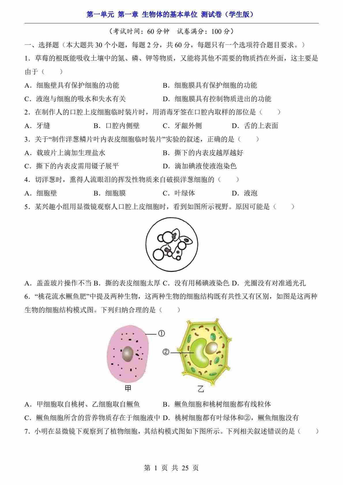 第1单元 第1章 生物体的基本单位(测试卷)