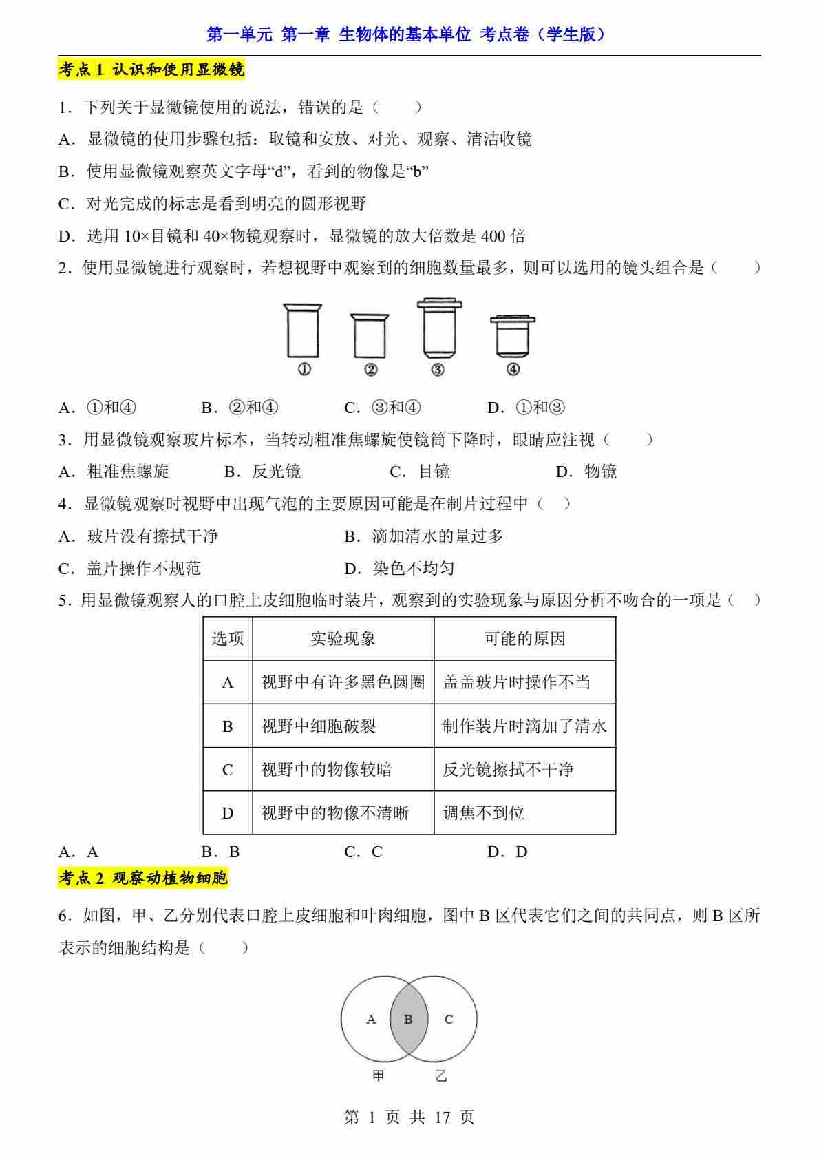 第1单元 第1章 生物体的基本单位(考点卷)