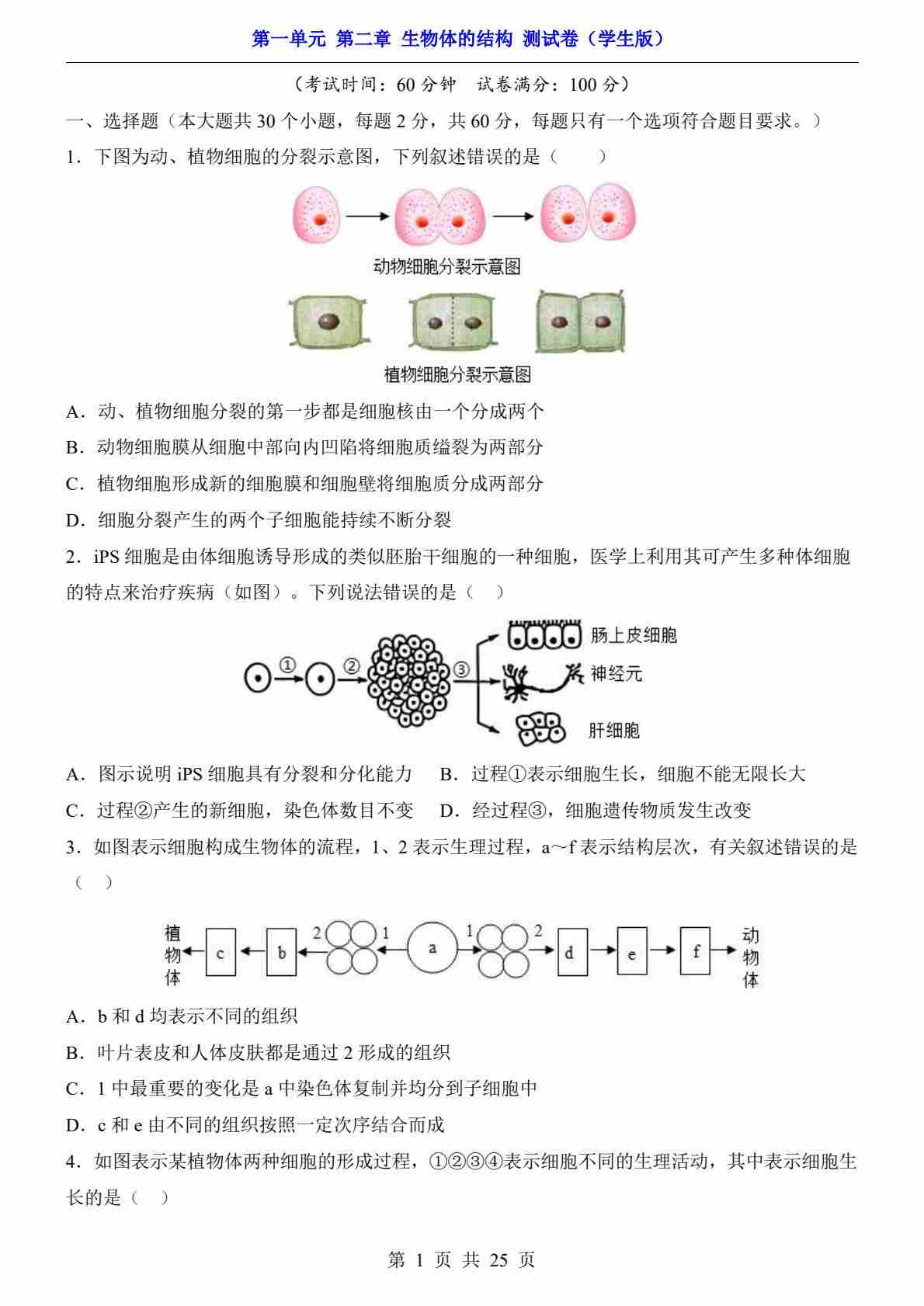 第1单元 第2章 生物体的结构(测试卷)