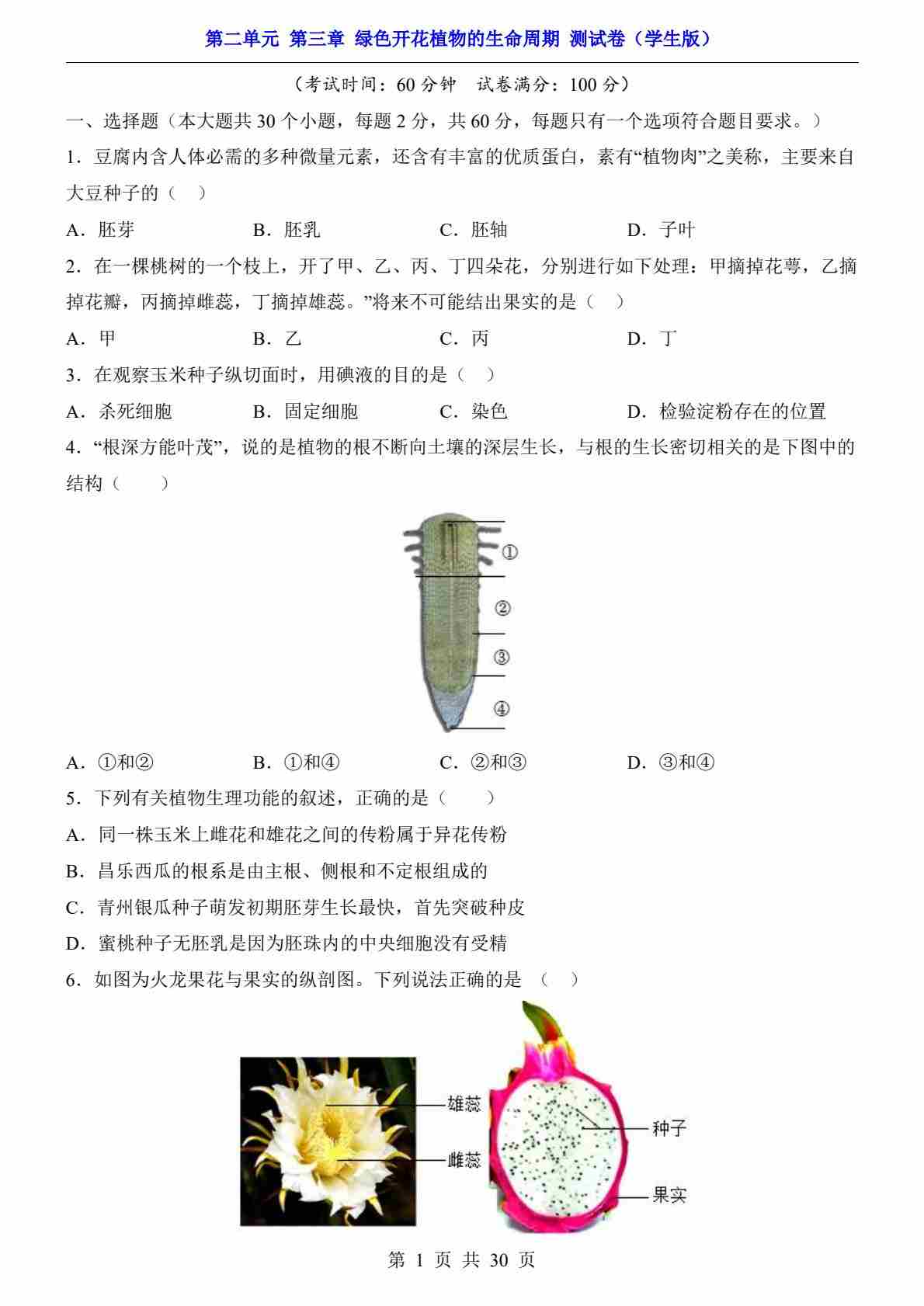 第2单元 第3章 绿色开花植物的生命周期(测试卷)