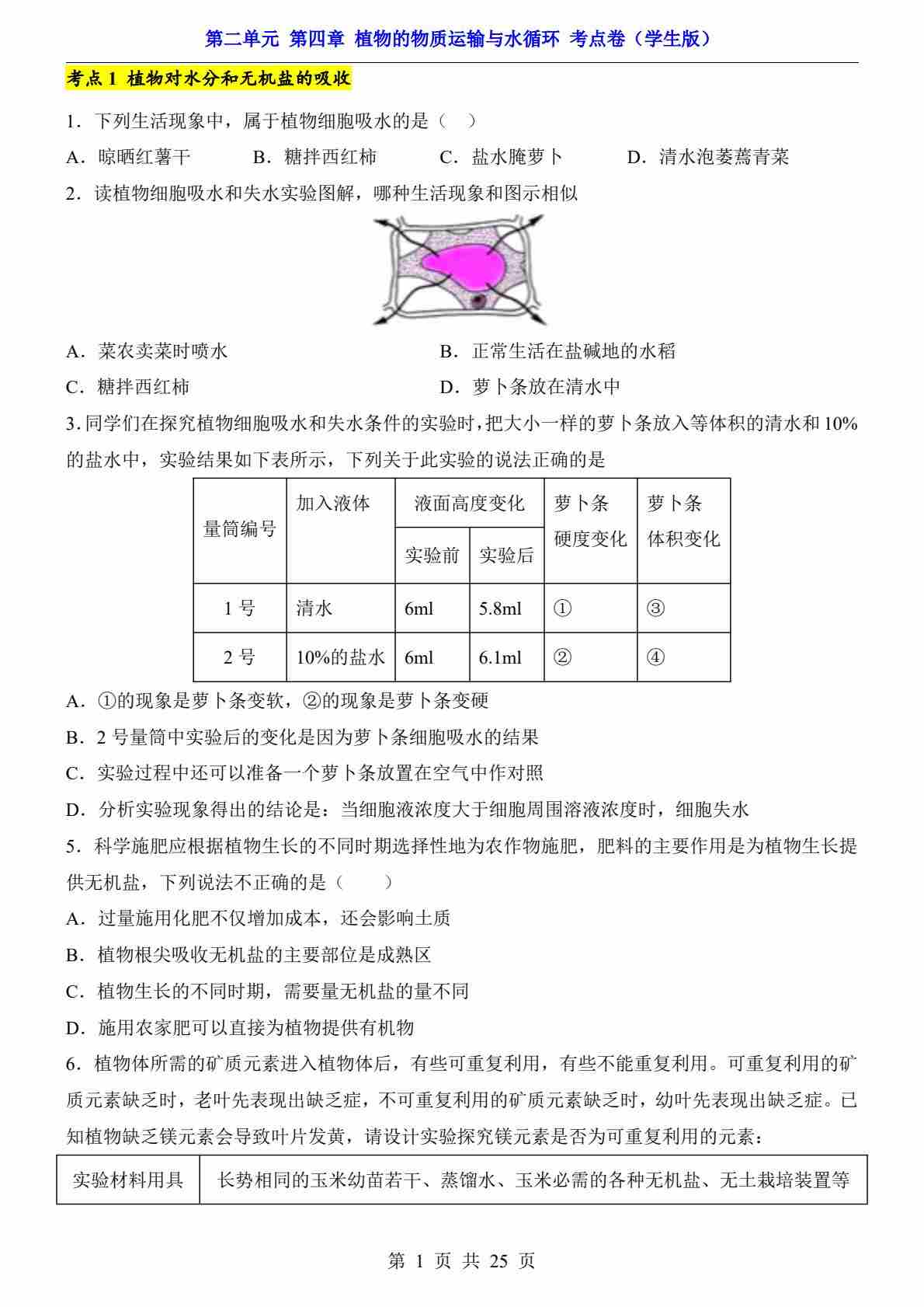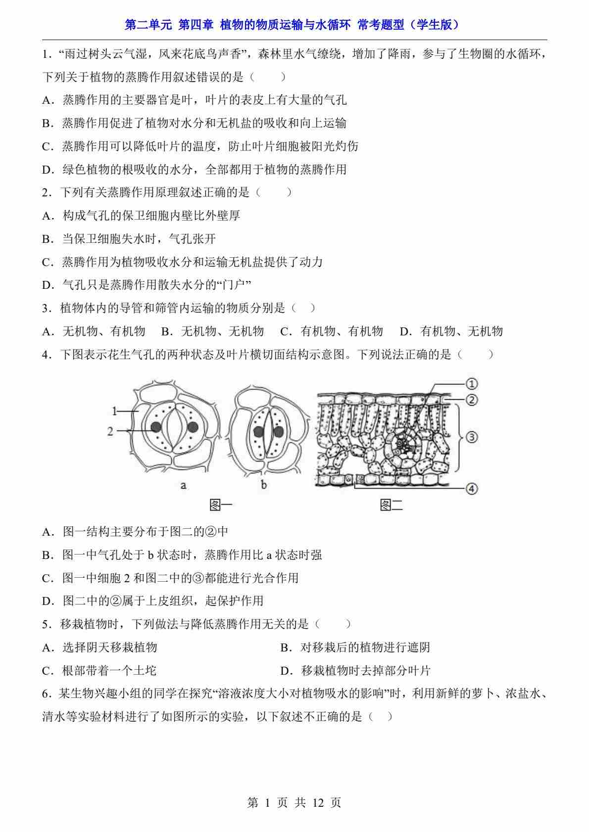 第2单元 第4章 植物的物质运输与水循环(考点卷)