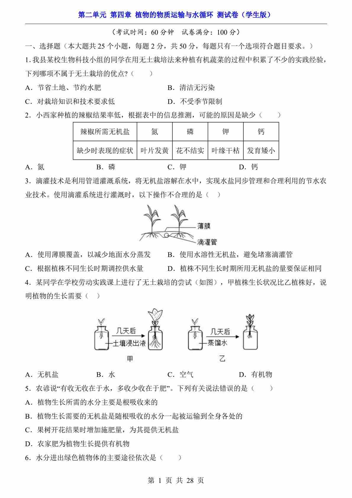 第2单元 第4章 植物的物质运输与水循环(测试卷)