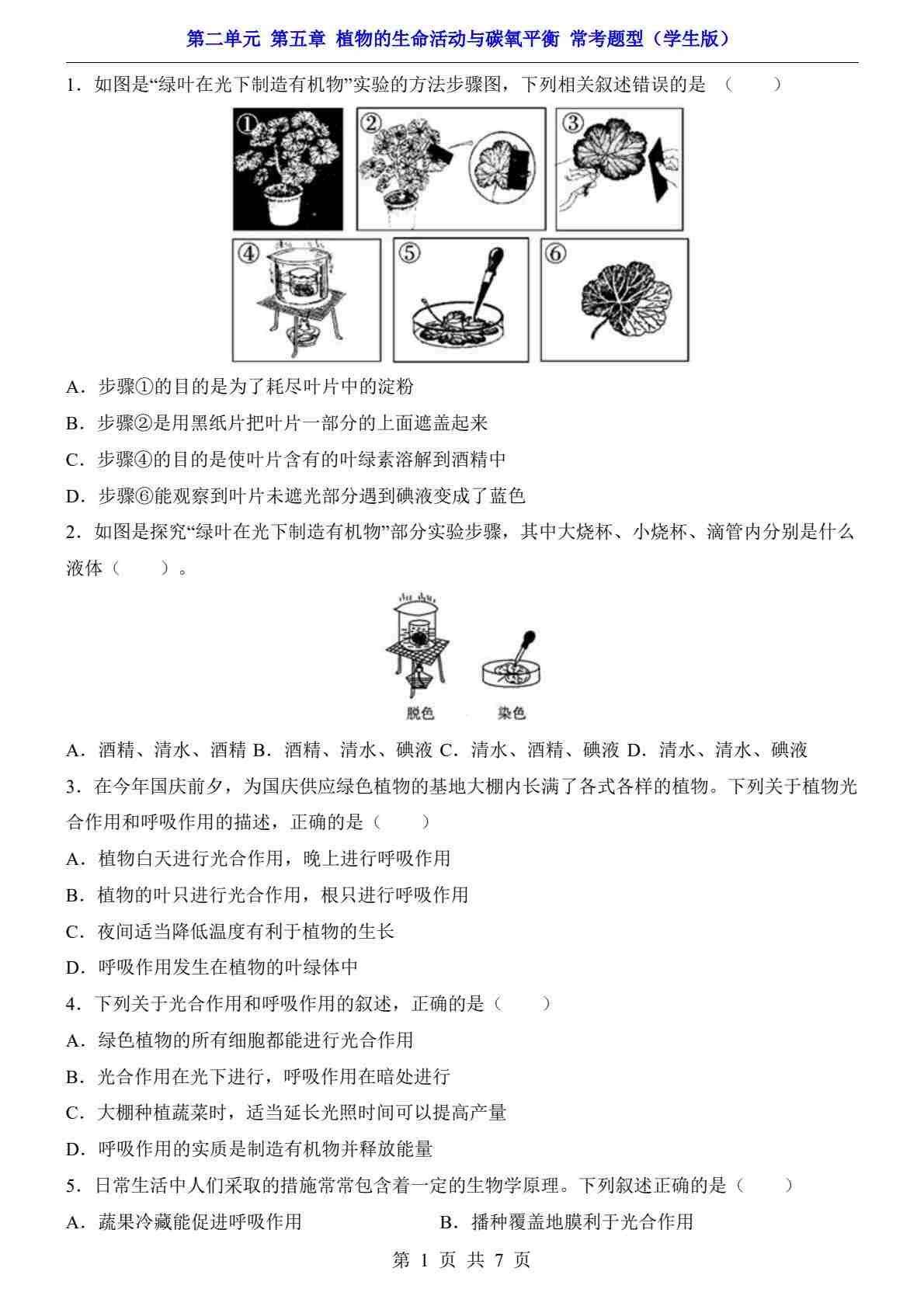 第2单元 第5章 植物的生命活动与碳氧平衡(常考题型)