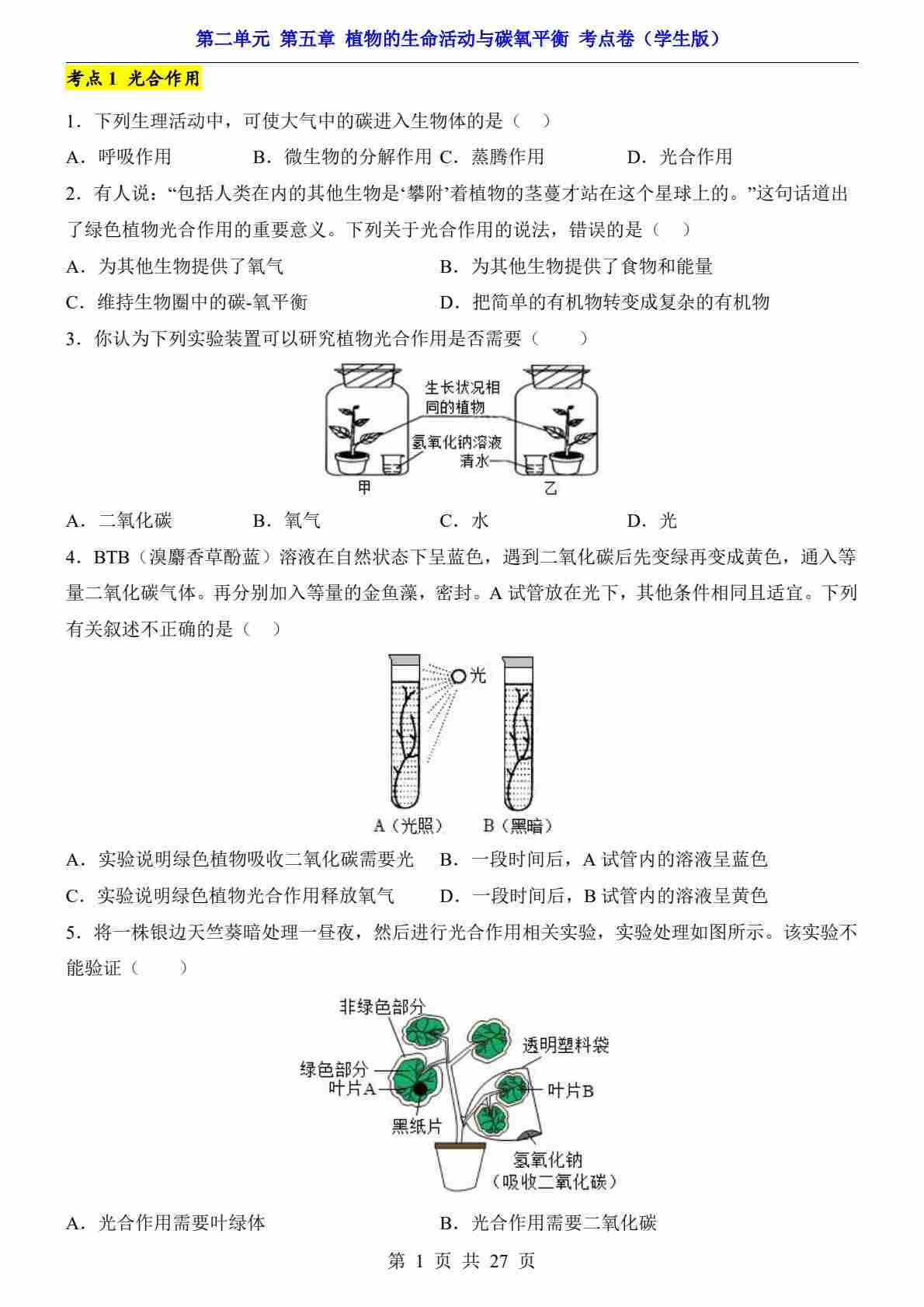 第2单元 第5章 植物的生命活动与碳氧平衡(考点卷)