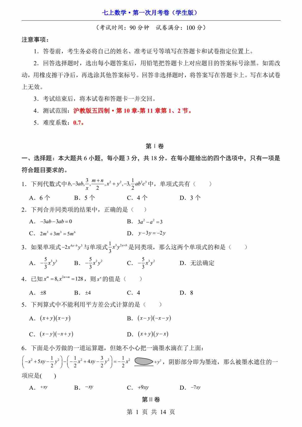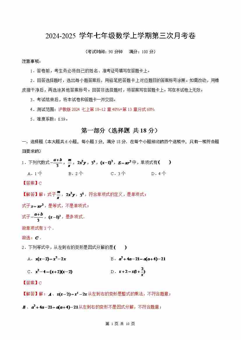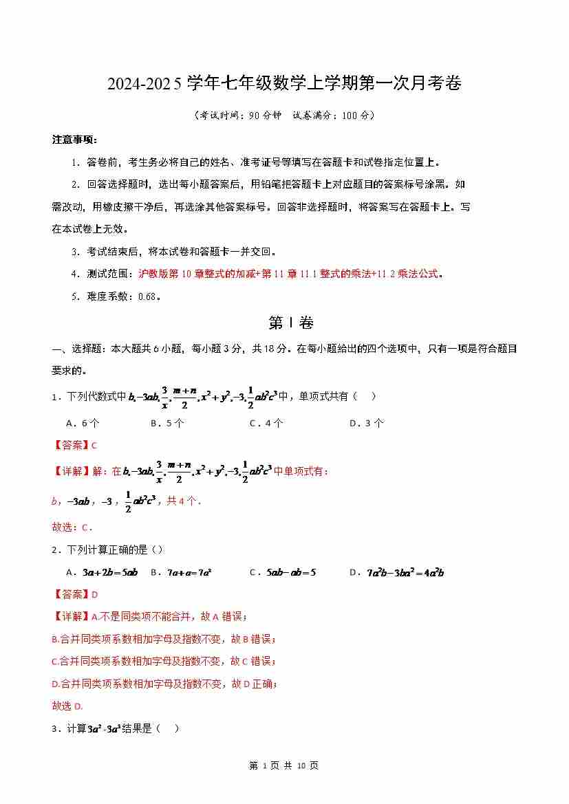 第10章:整式的加减【单元卷·考点卷】(沪教版2024)(原卷版)