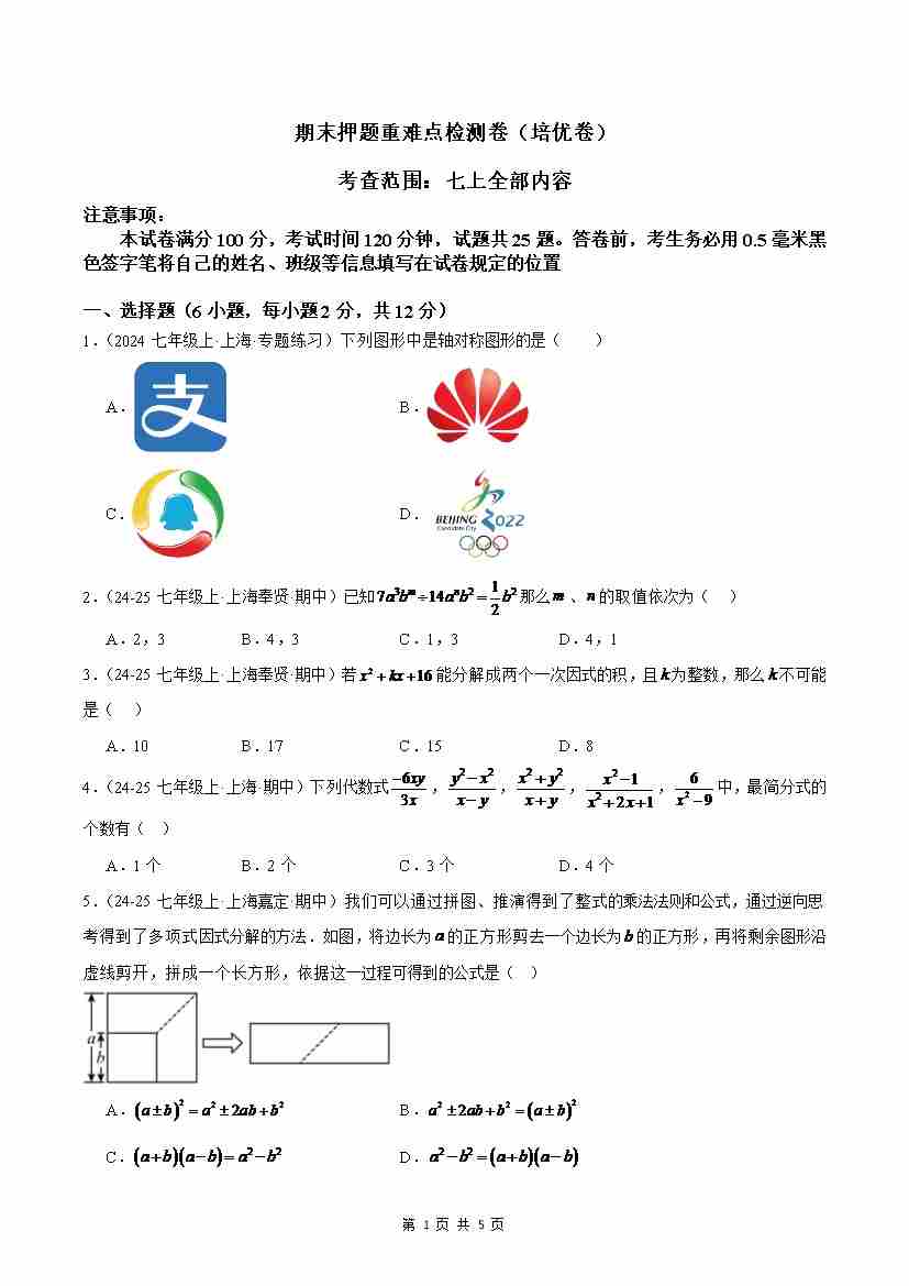 七上数学期末押题重难点检测卷(培优卷)(沪教版2024)(原卷版)