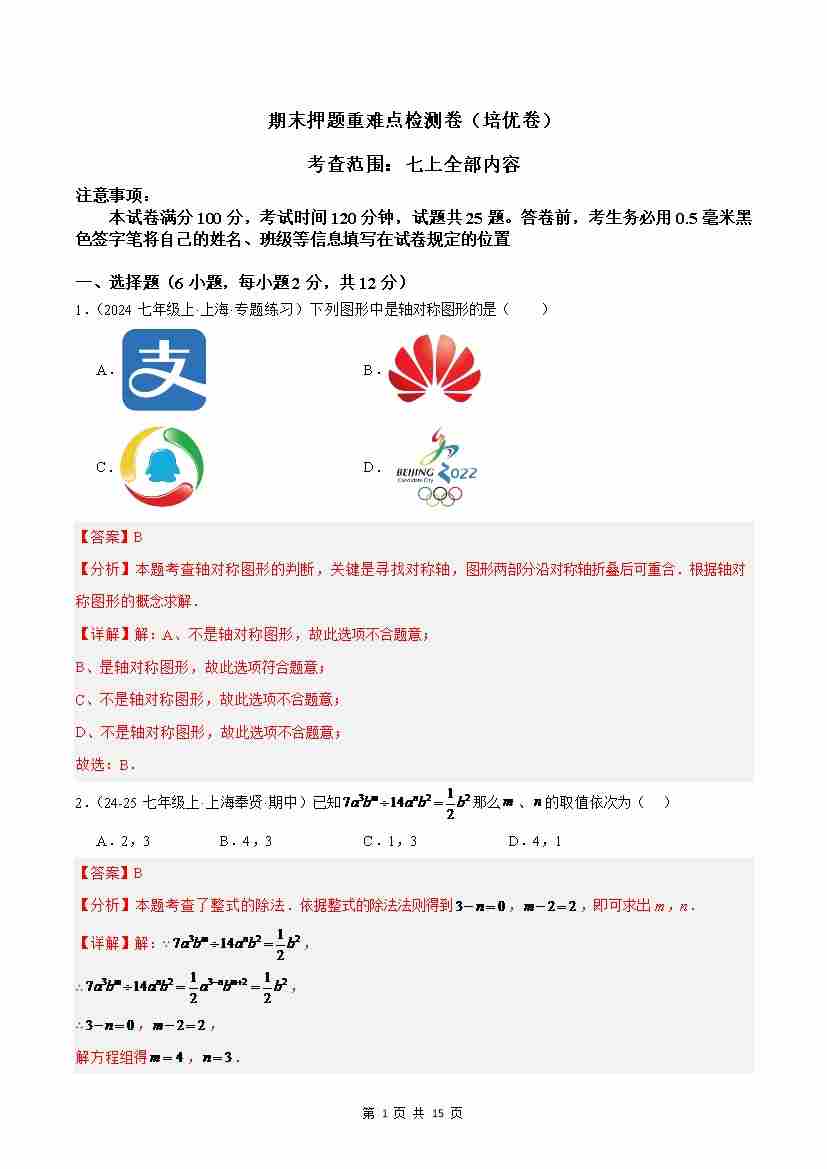七上数学期末押题重难点检测卷(培优卷)(沪教版2024)(解析版)