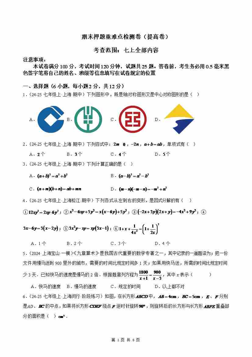 七上数学期末押题重难点检测卷(提高卷)(沪教版2024)(原卷版)