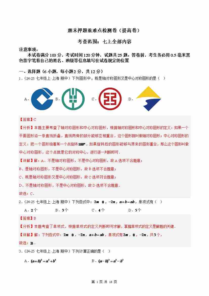 七上数学期末押题重难点检测卷(提高卷)(沪教版2024)(解析版)