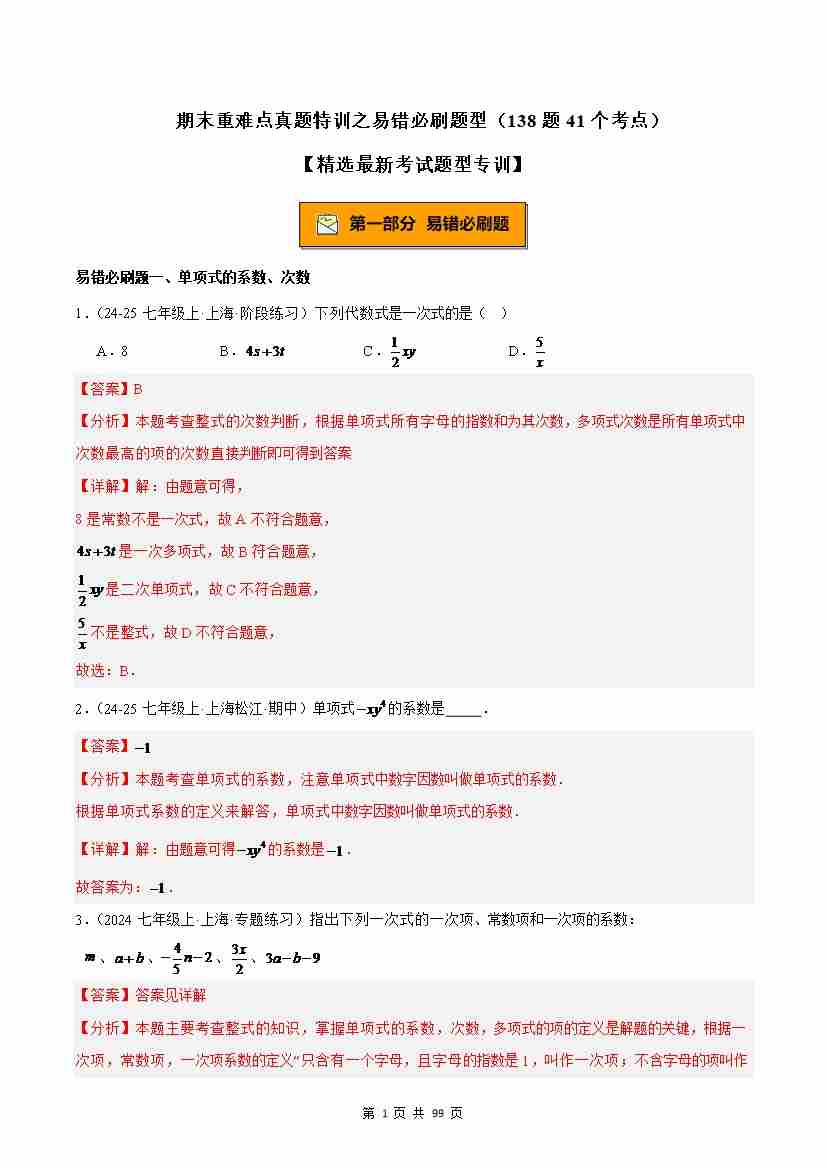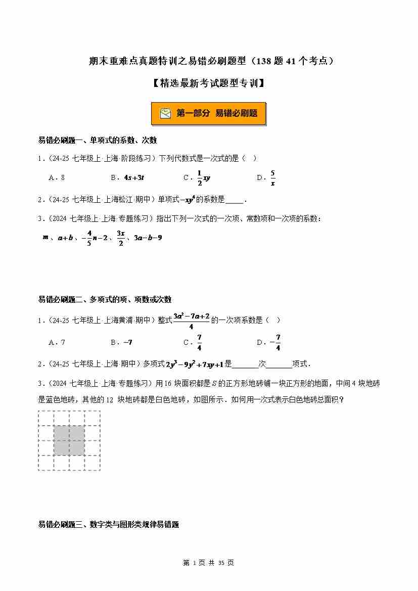 七上数学期末重难点真题特训之易错必刷题型(138题41个考点)(沪教版2024)(原卷版)