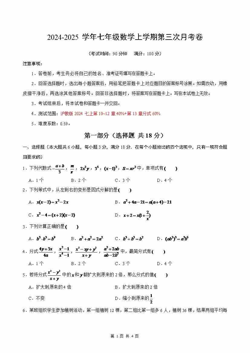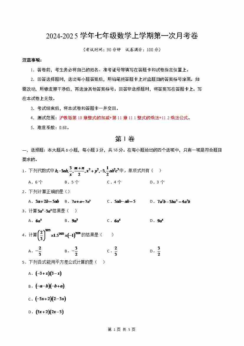 七年级数学第一次月考卷(沪教版2024)(考试版A4)