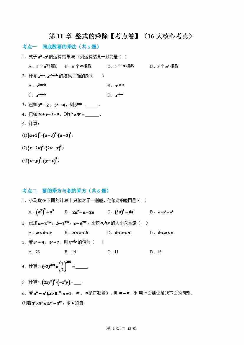 第11章:整式的乘除【考点卷】(沪教版2024)(原卷版)