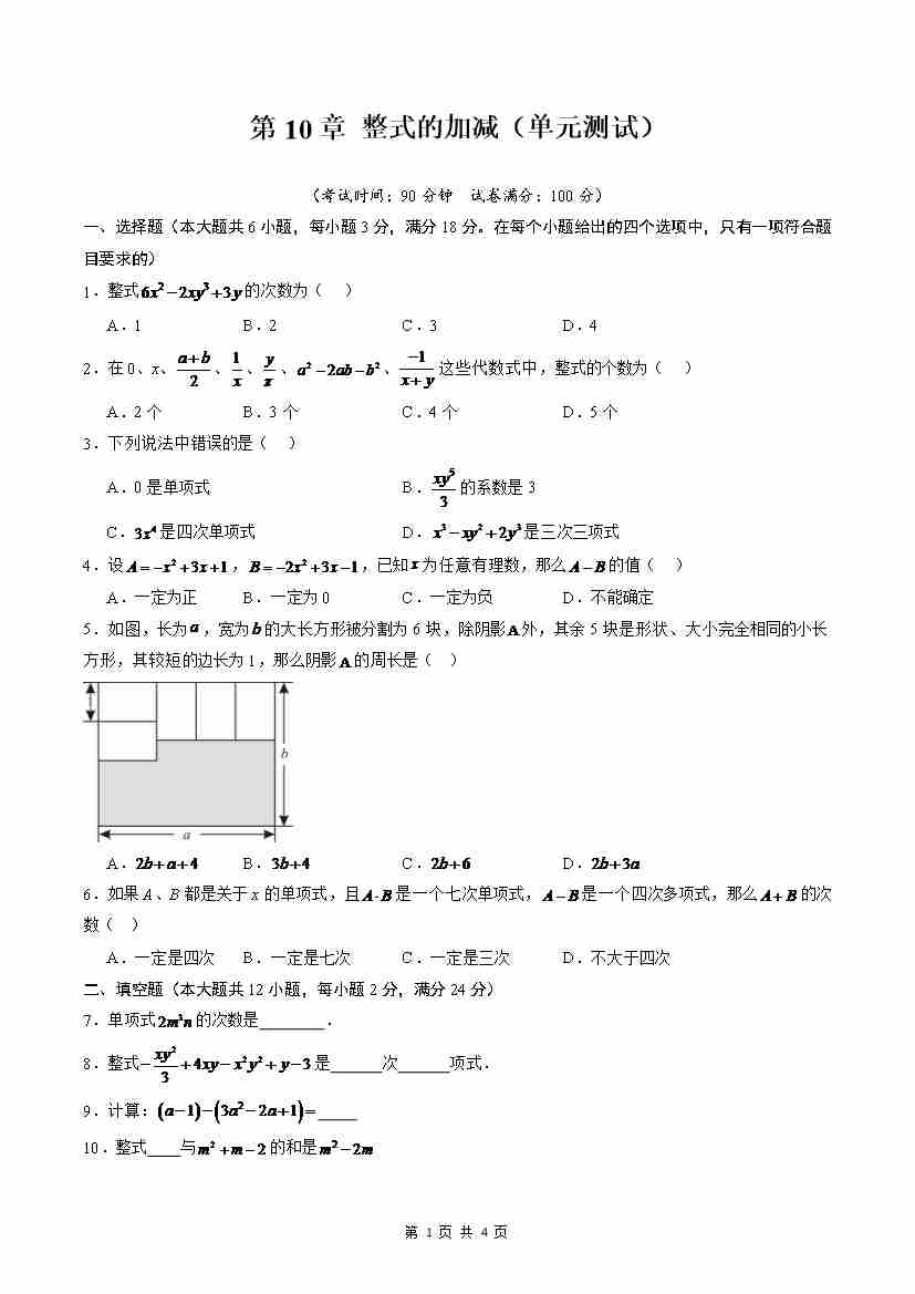 【沪教】第10章:整式的加减(单元测试)(原卷版)