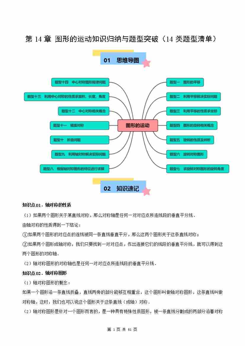 第14章:图形的运动知识归纳与题型突破(14类题型清单)(沪教版2024)(解析版)