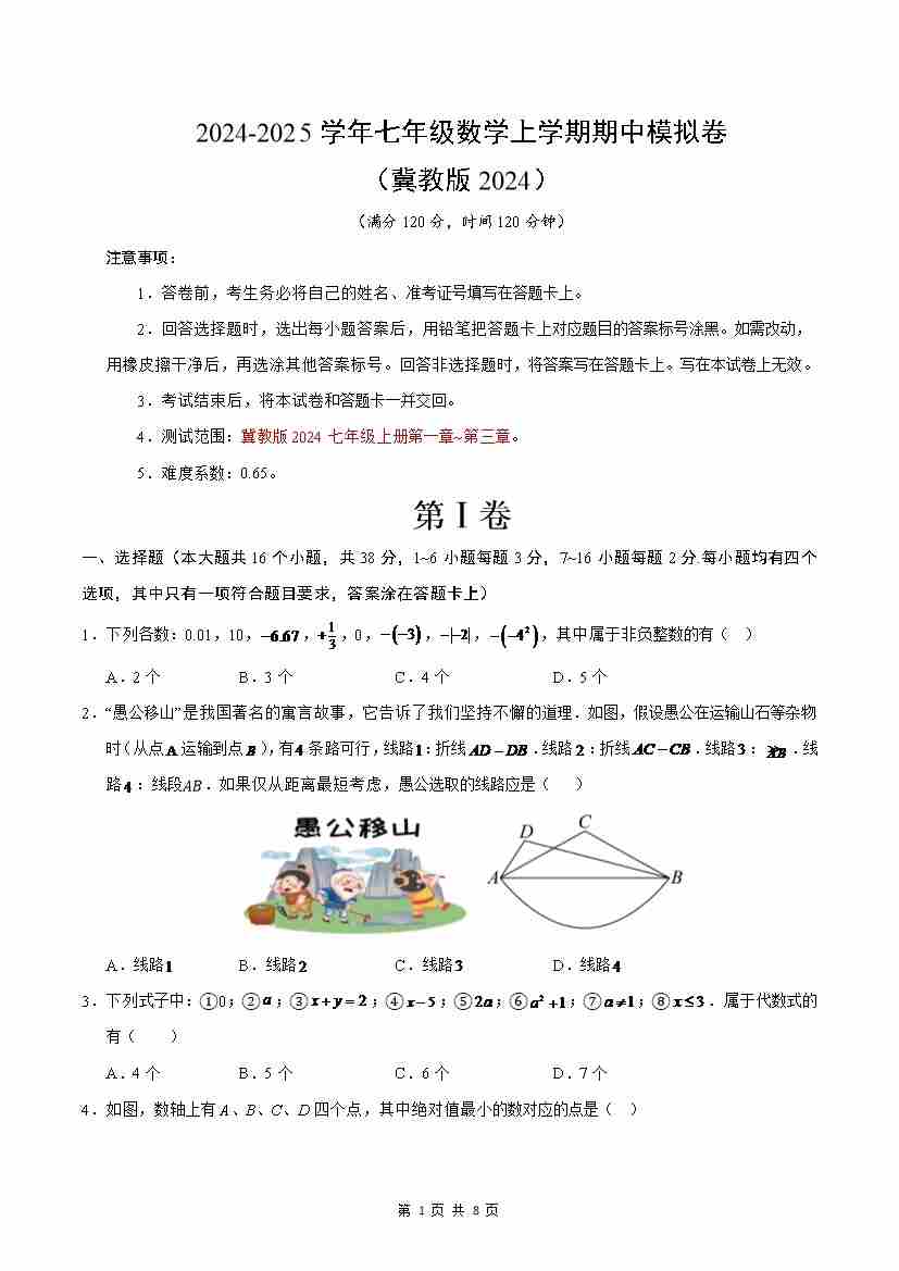 七年级数学期中模拟卷【测试范围:七上第1~3章】(考试版A4)(冀教版2024)