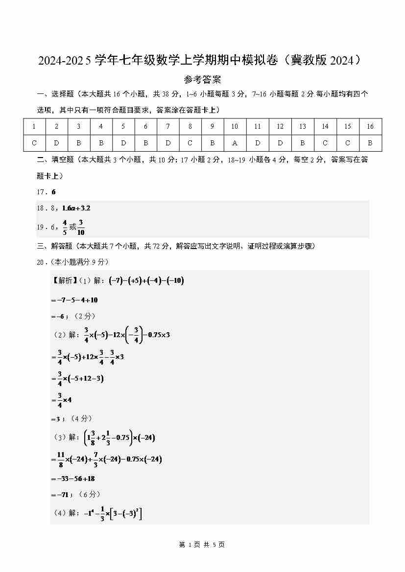 七年级数学期中模拟卷(参考答案)(冀教版2024)