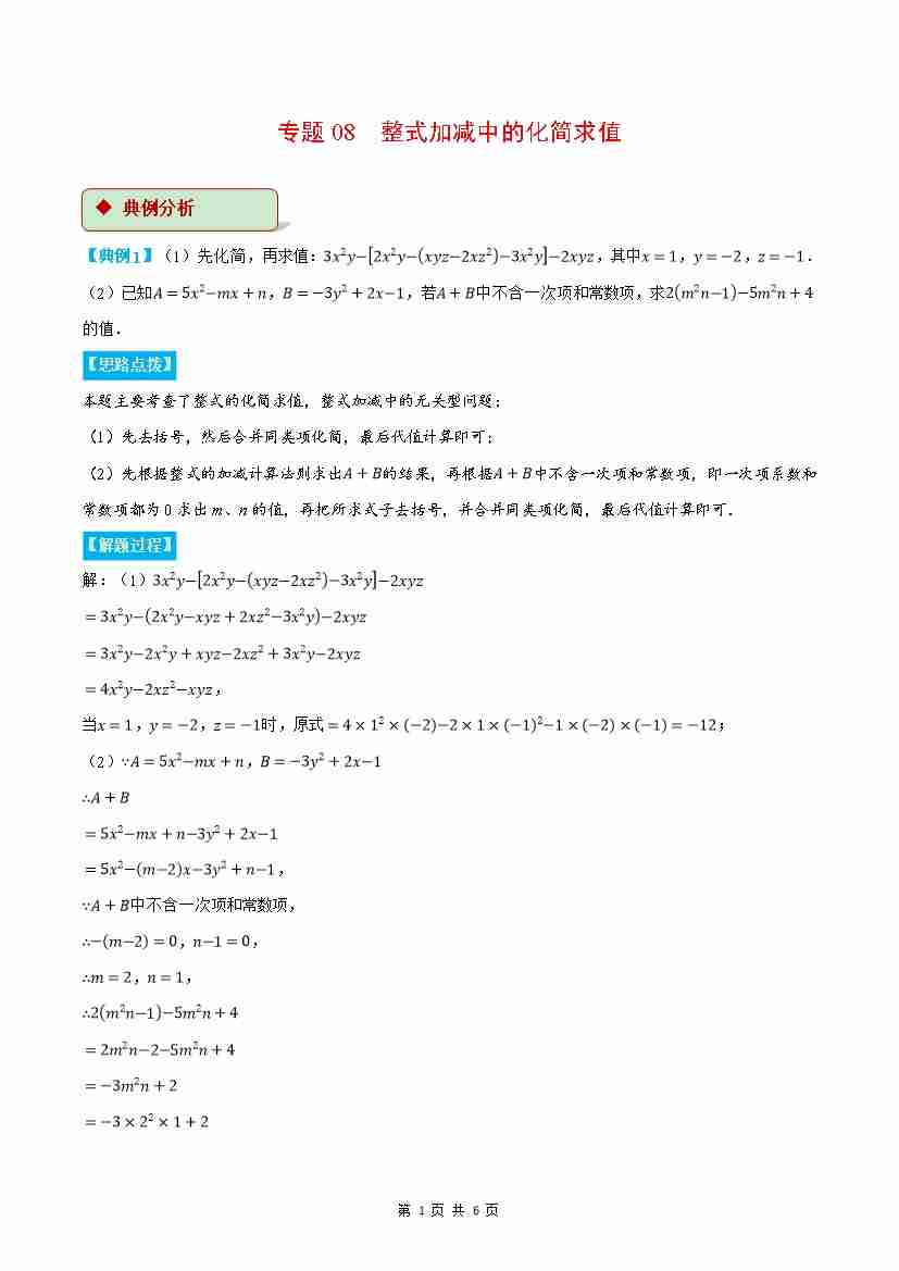 专题08 整式加减中的化简求值(解析版)