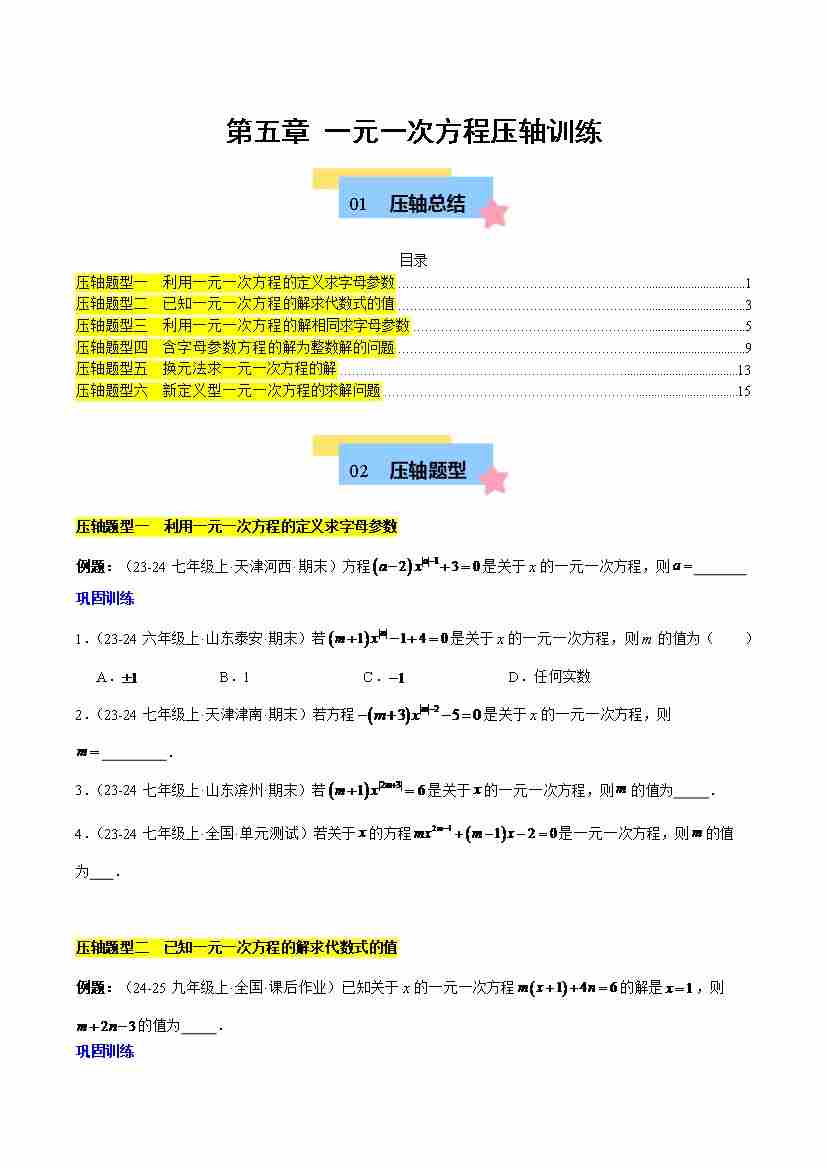第五章 一元一次方程压轴训练(单元复习 含参数问题、换元法、新定义型)(原卷版)