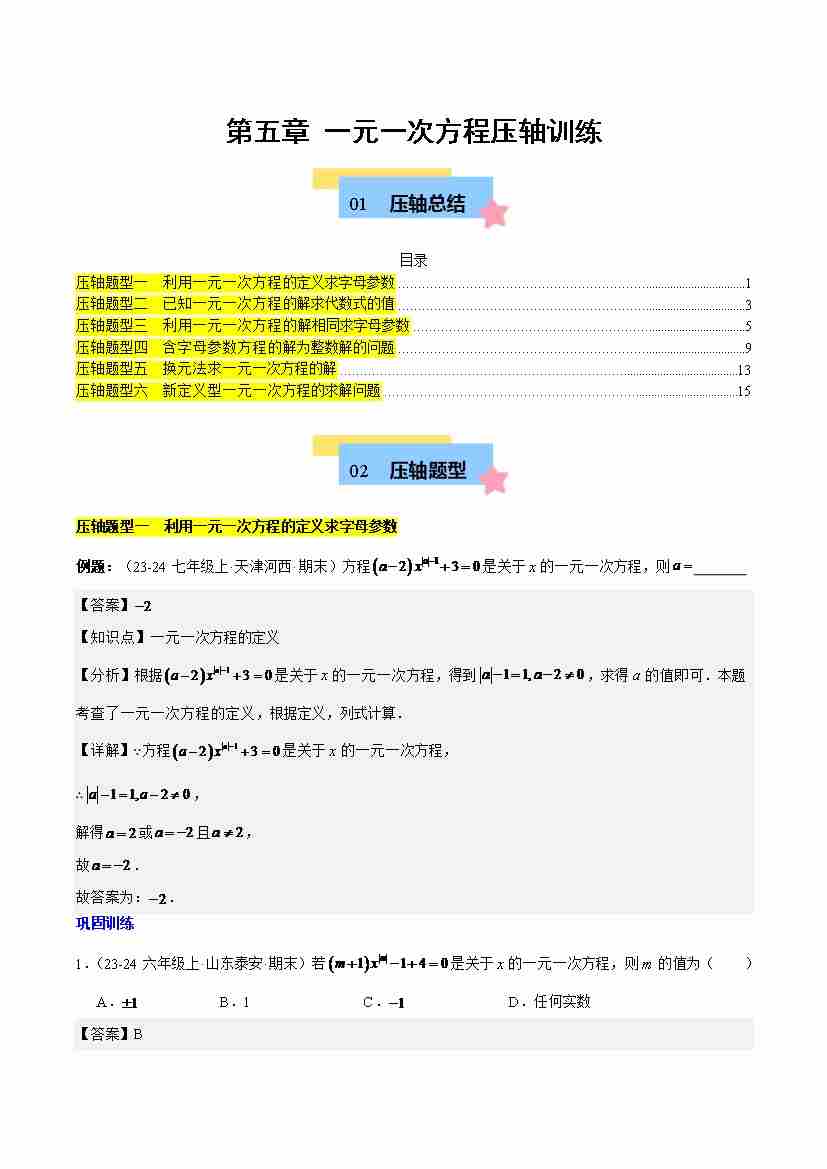 第五章 一元一次方程压轴训练(单元复习 含参数问题、换元法、新定义型)(解析版)