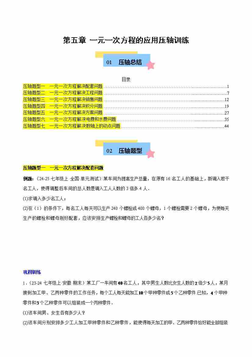 第五章 一元一次方程的应用压轴训练(单元复习 7类压轴)(原卷版)