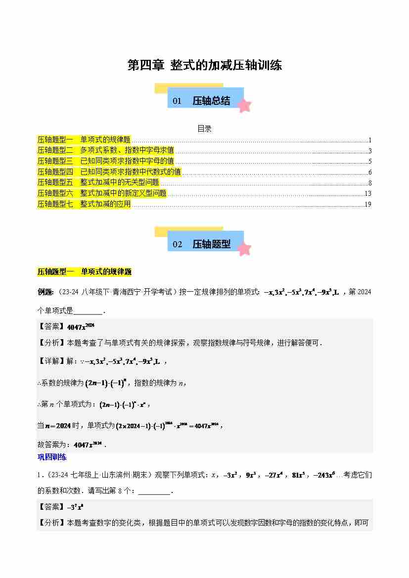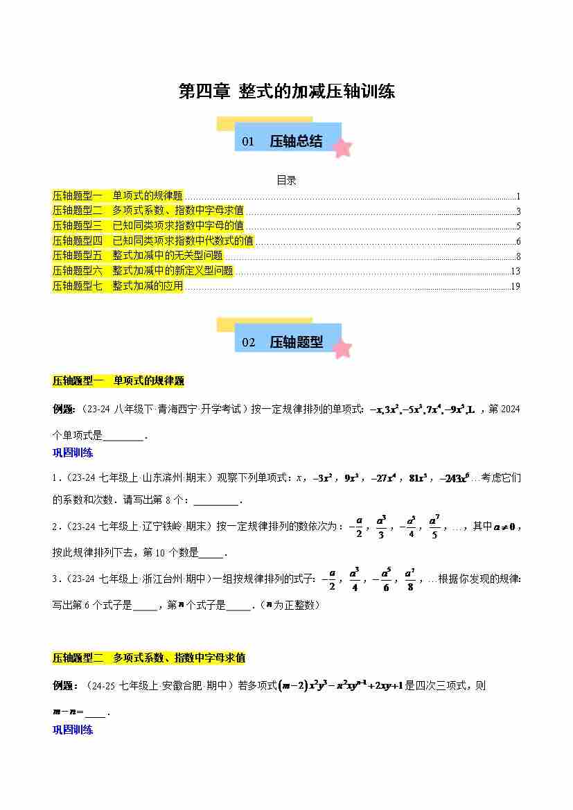 第四章 整式的加减压轴训练(单元复习 7类压轴)(原卷版)