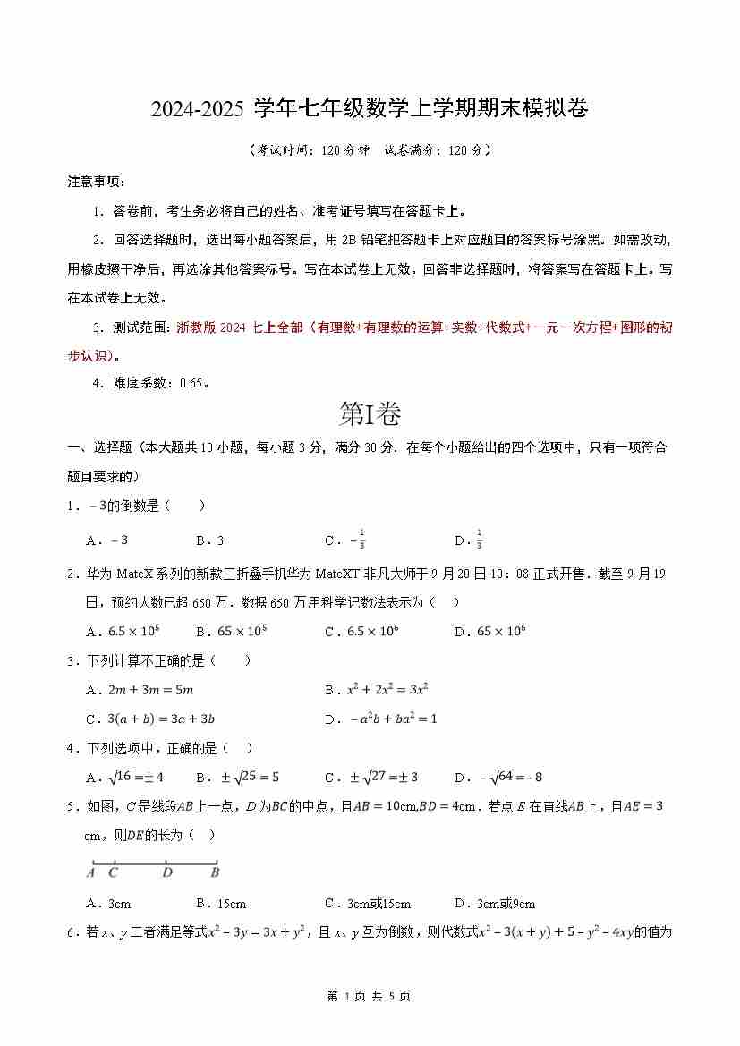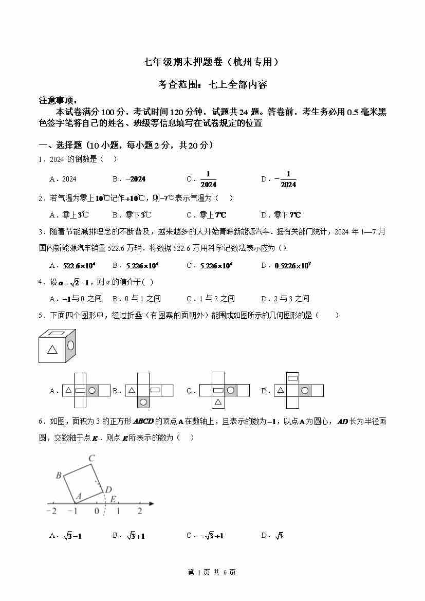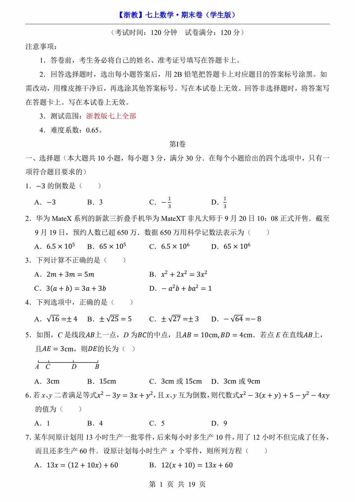 七年级数学期末模拟卷(考试版A4)(浙教版)