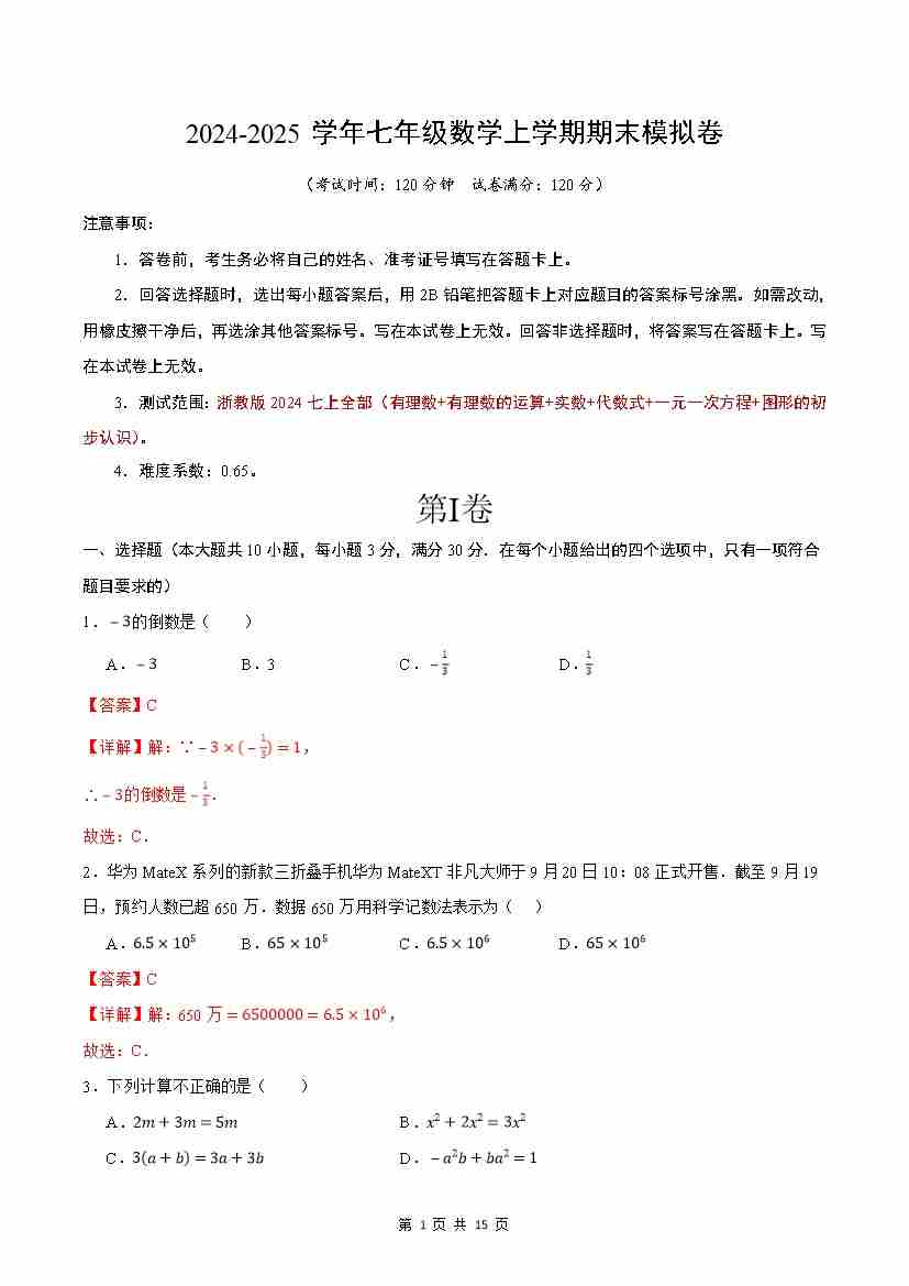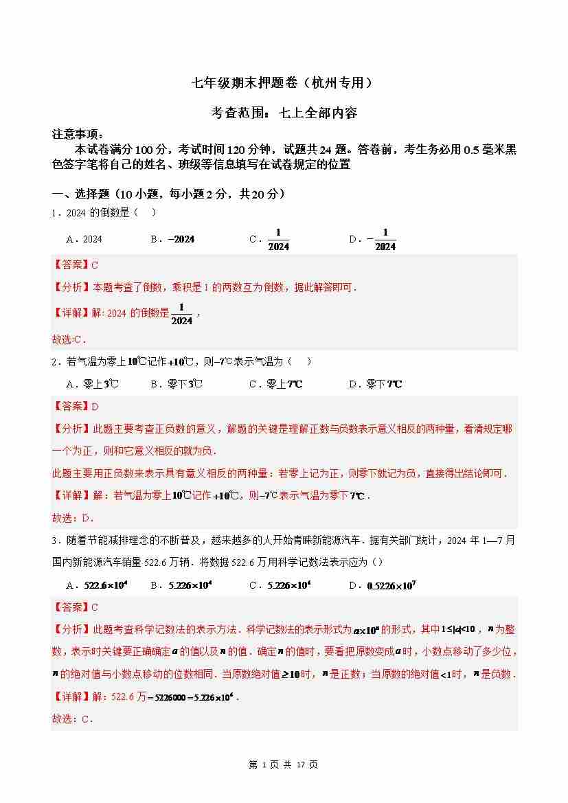 七年级数学期末模拟卷(全解全析)(浙教版)