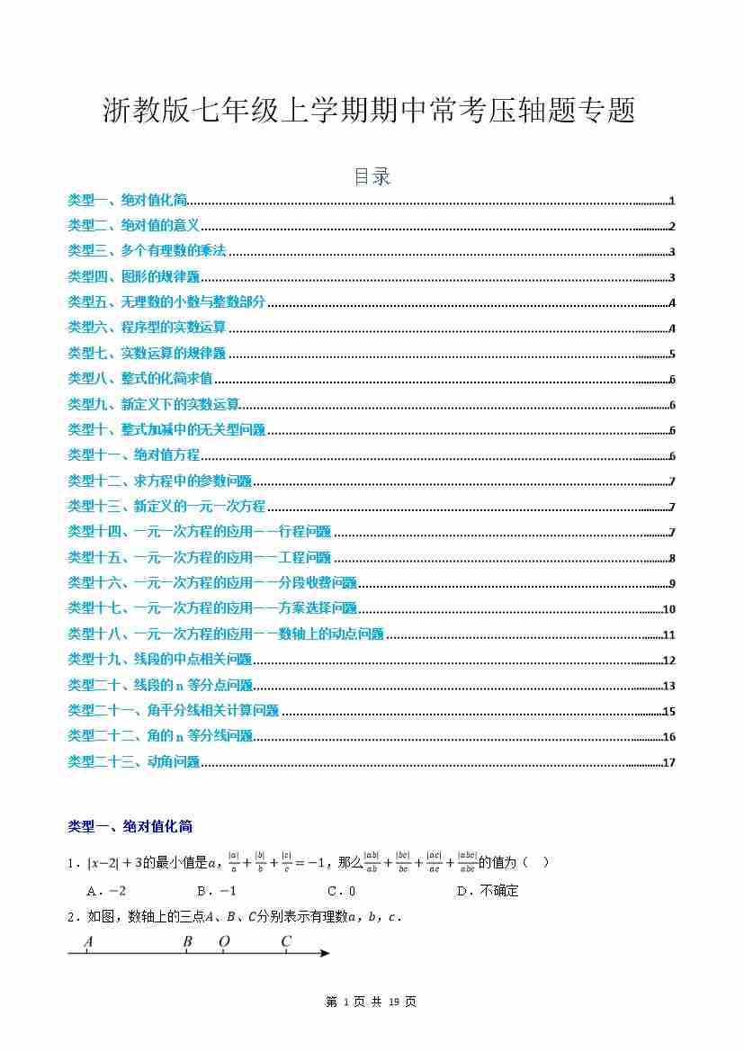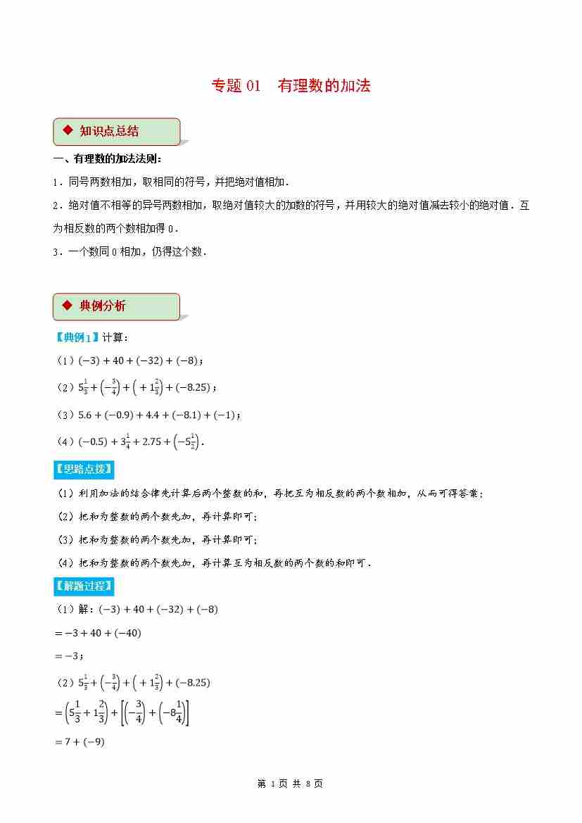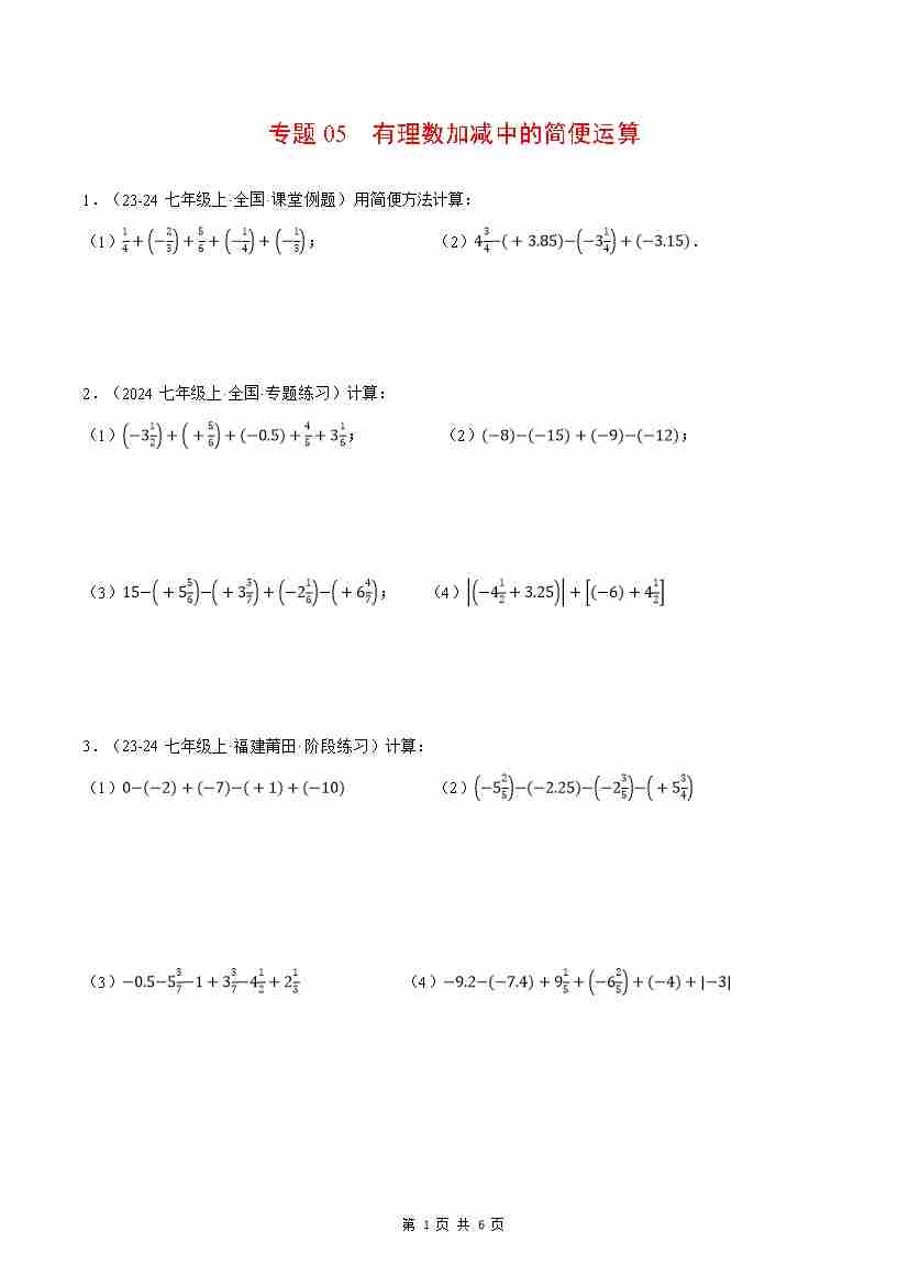 专题01 有理数的加法(计算题专项训练)(浙教版2024)(原卷版)